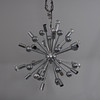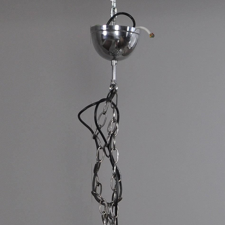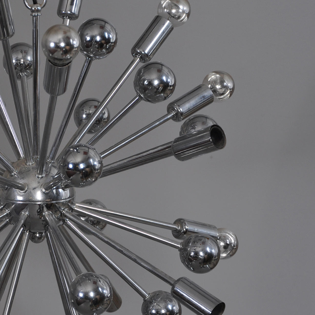 Pyöreä kromattua valkoista metallia valaisin, jossa 16 valopistettä sauvassa Halkaisija n. 60 cm Korkeus kuppiin n. 125 cm.