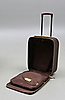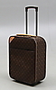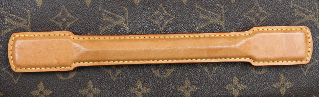 Monogrammikangas, nahkayksityiskohdat, messinkihelat, vetoketjullisten lokeroiden sisäpuoli. Mukana lukko ja 2 avainta Pituus 36, leveys 19, kokonaiskorkeus taitettu kahva mukaan lukien 49 cm.
