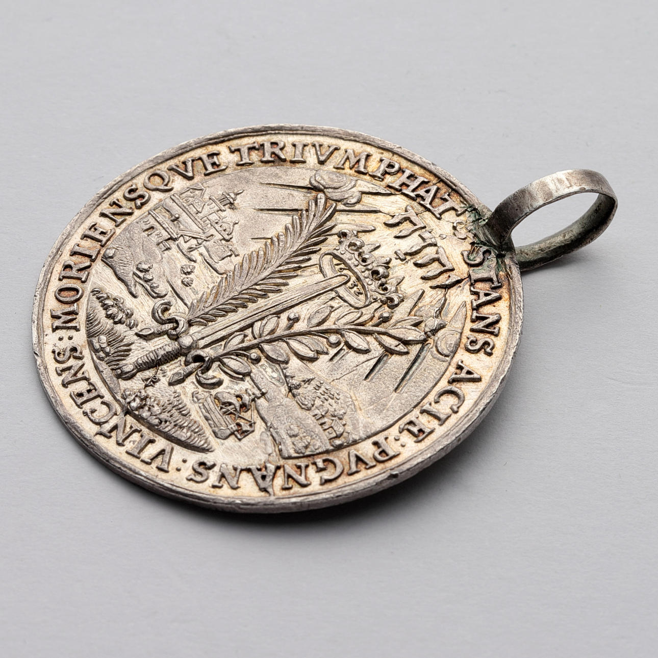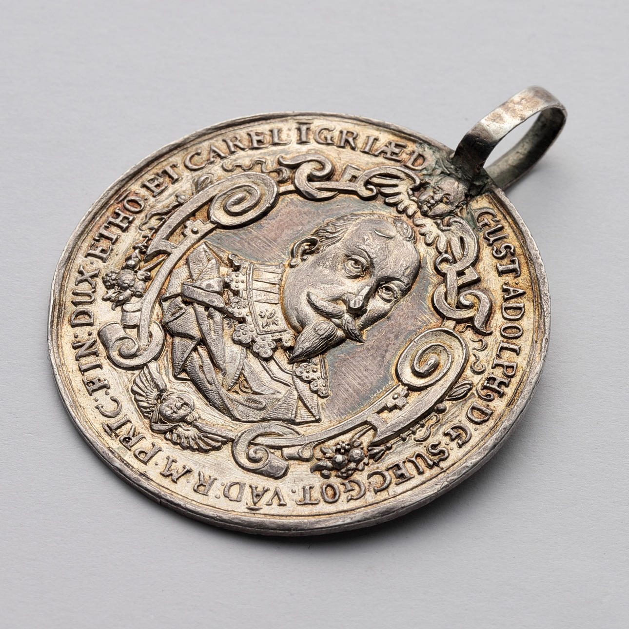 Kuninkaan sankarillinen kuolema taistelukentällä Lutzenissa 1632 haudattu Riddarholmin kirkkoon 22.6.1634, kaivertaja Rull Dresdenissä, hopea, paino 18,6g, halkaisija 40mm.