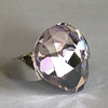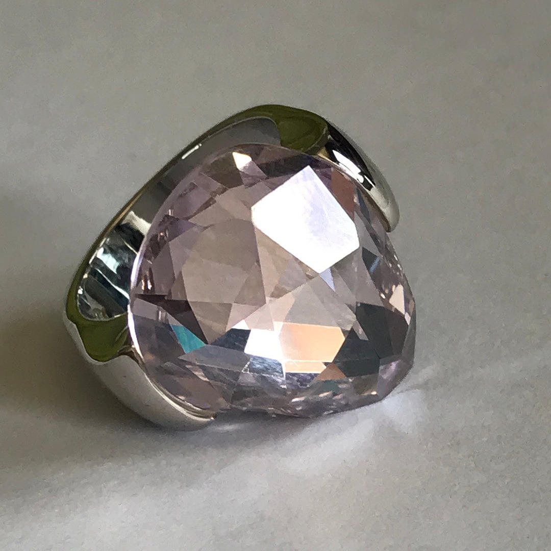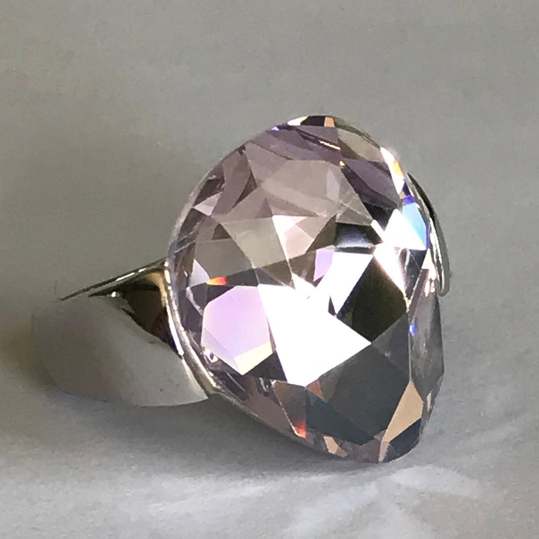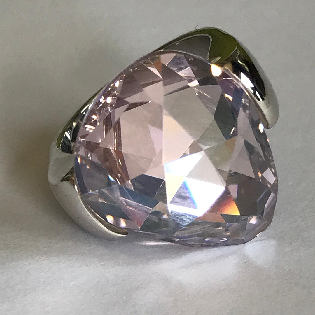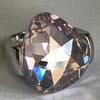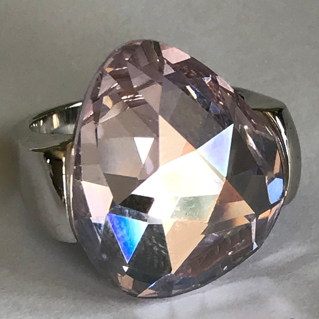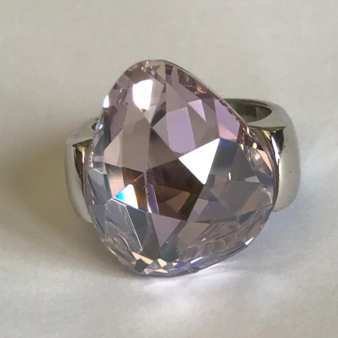 Tämä sormus on Swarovskin valmistama ja se on valkokultainen. Sormus on asetettu suurella vaaleanpunaisella kristallilla, joka istuu valkokullan sävyisellä alustalla.