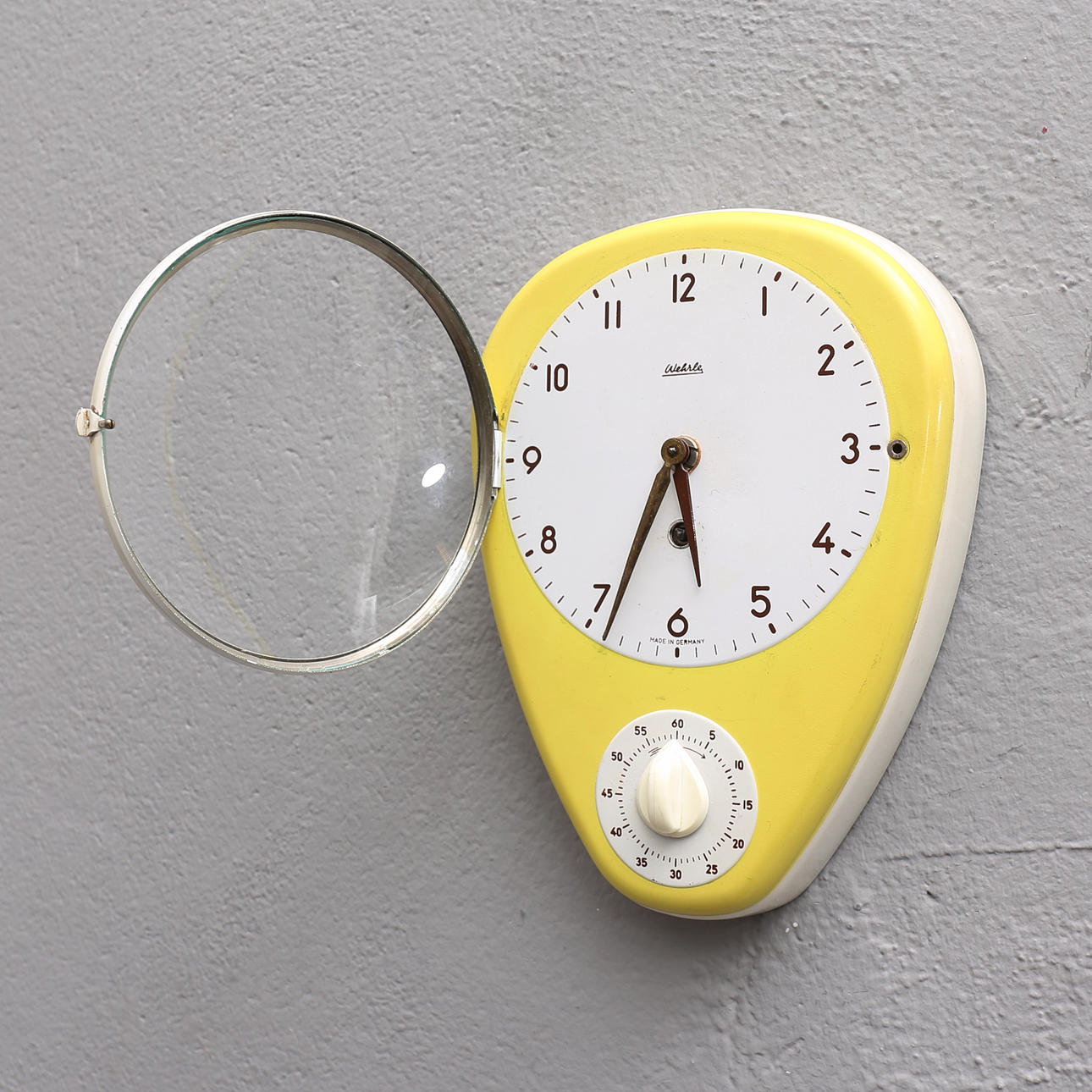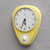 Seinäkello ajastimella. Korkeus 25 cm. Keltainen/valkoinen levy.