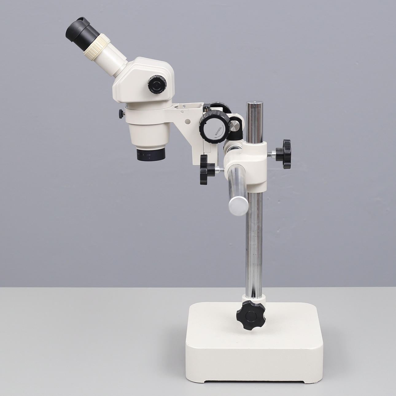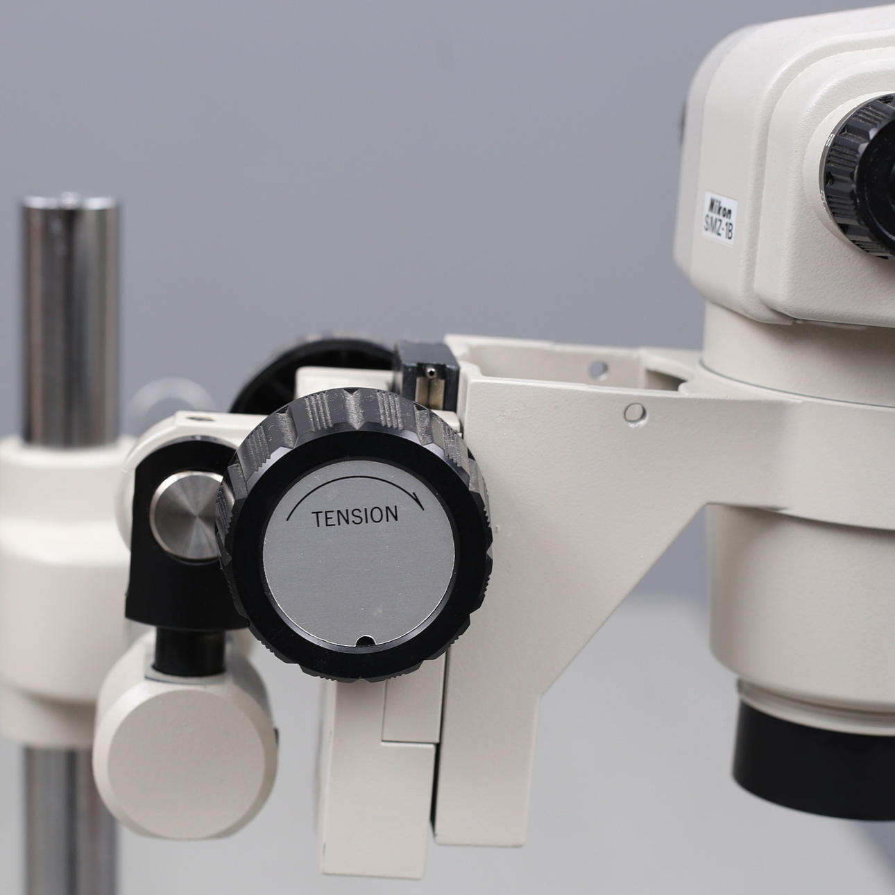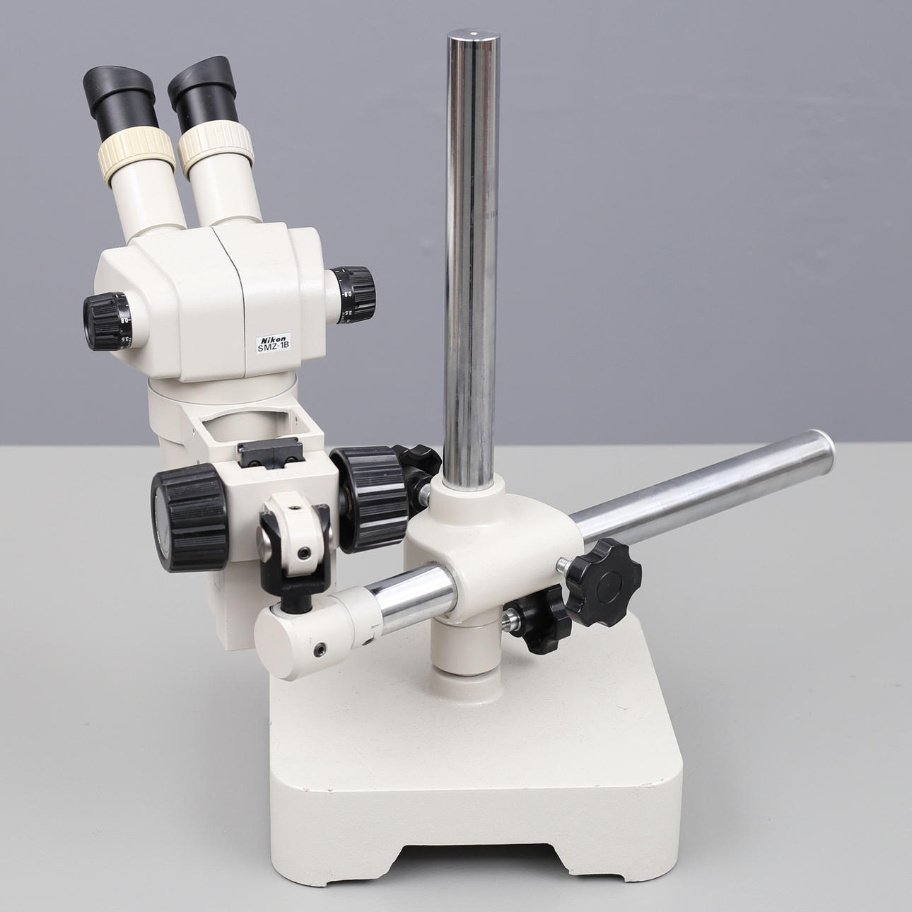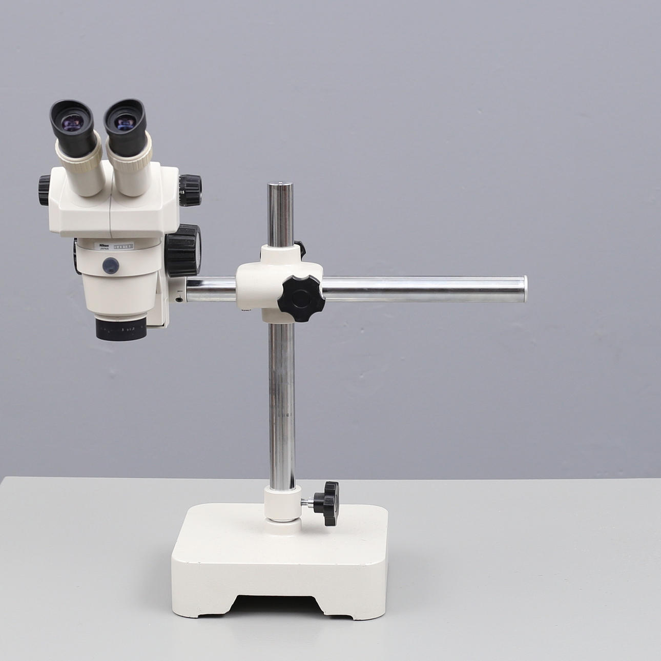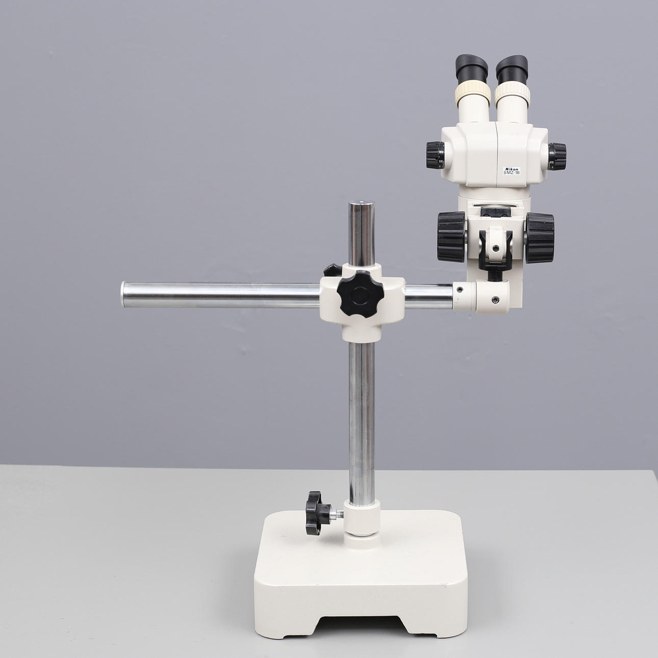 Nikon SMZ-1B laboratoriomikroskooppi säädettävällä alkuperäisellä jalustalla. Nikon x 10 okulaarit.