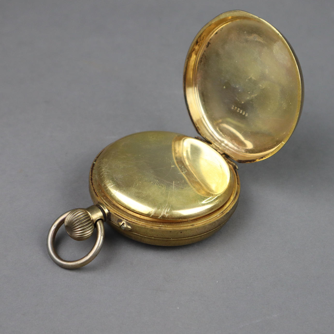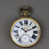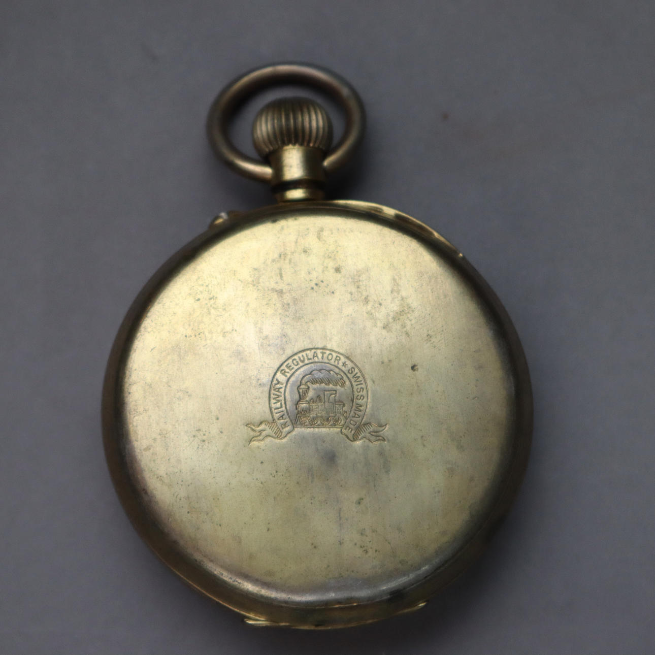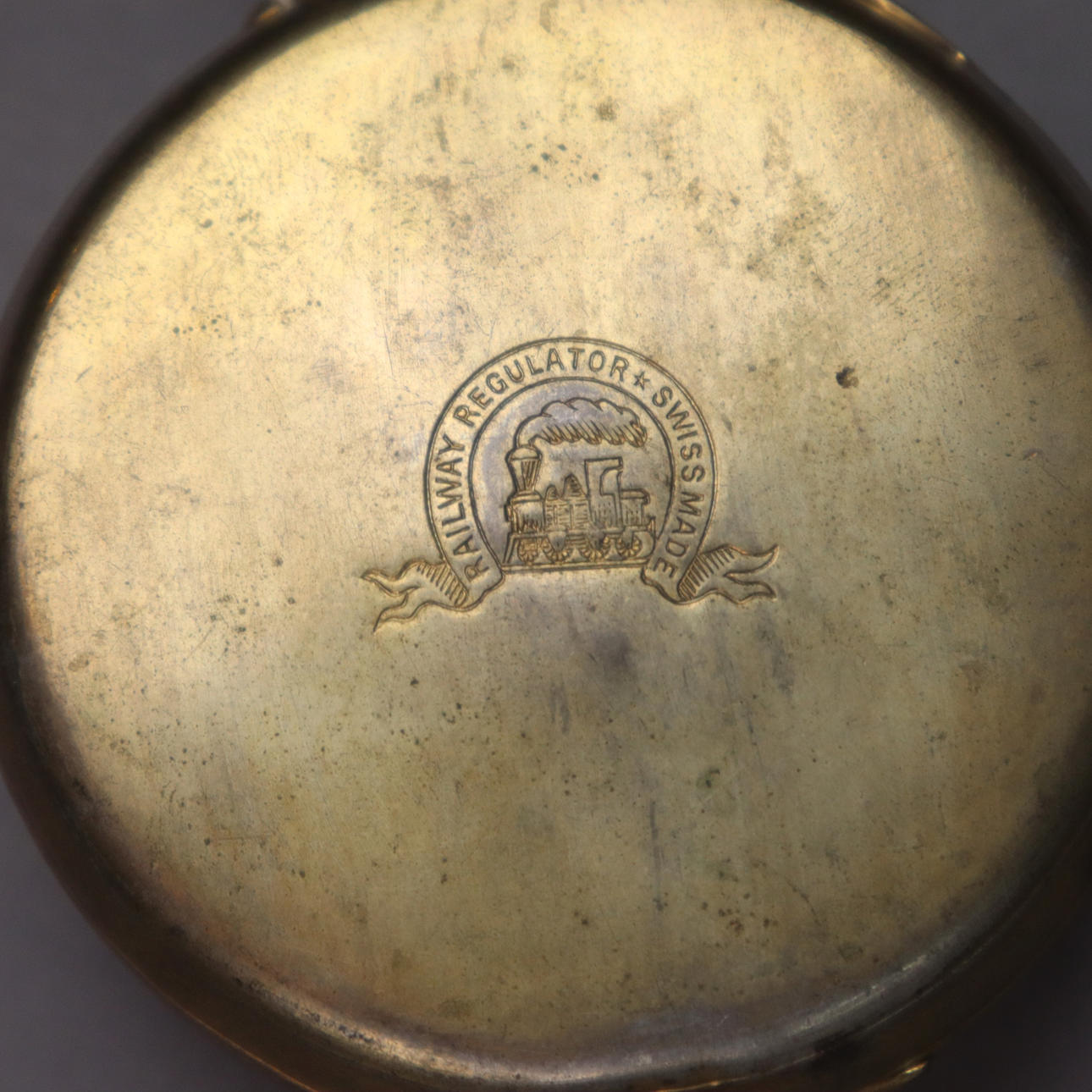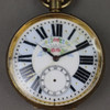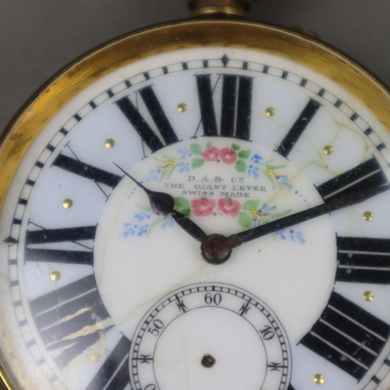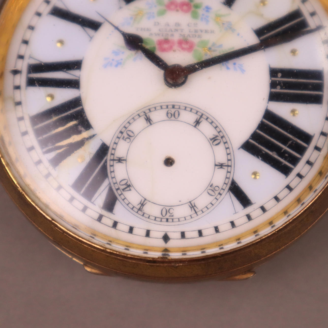 Valkoinen emaloitu kellotaulu roomalaisilla numeroilla ja kukkamaalauksella, merkintä "DA& Co.The Giant Lever Swiss Made", toisella tunnusmerkillä veturi ja merkintä "Railway Regulator Swiss Made", halk. noin 6 cm.