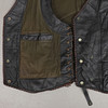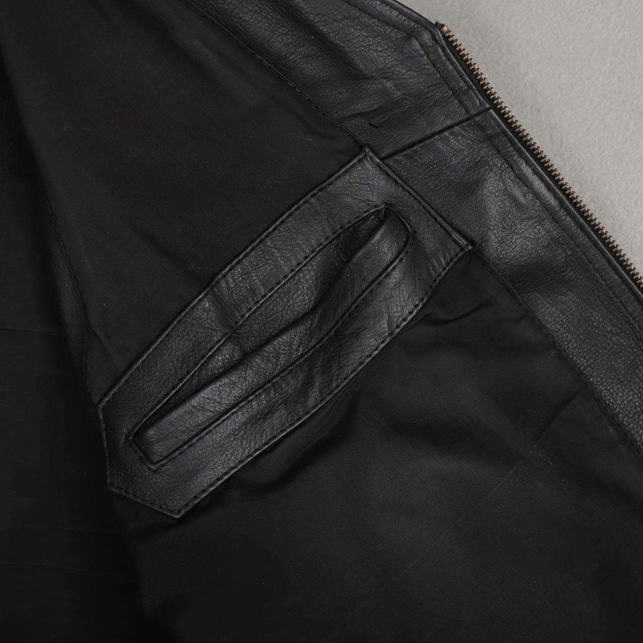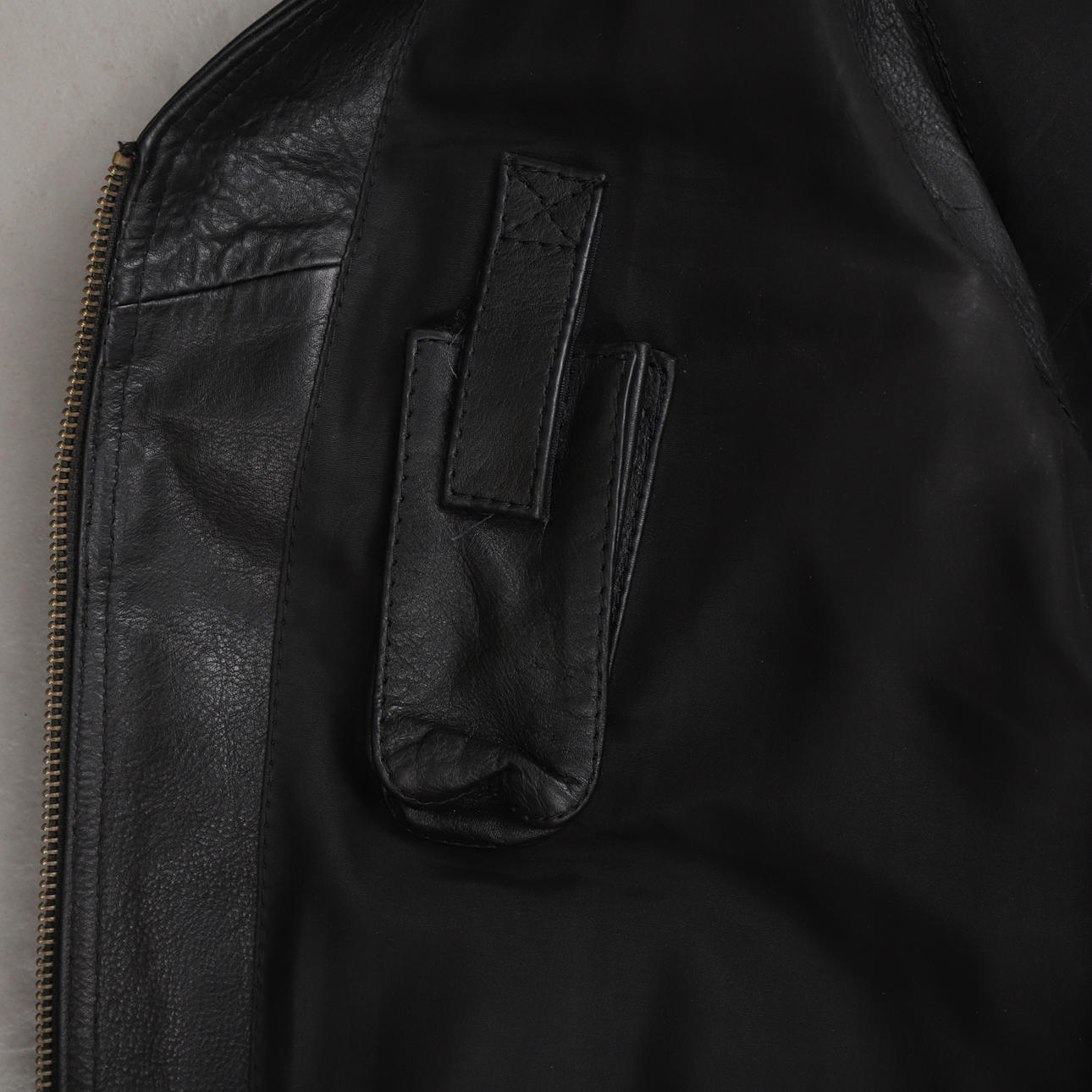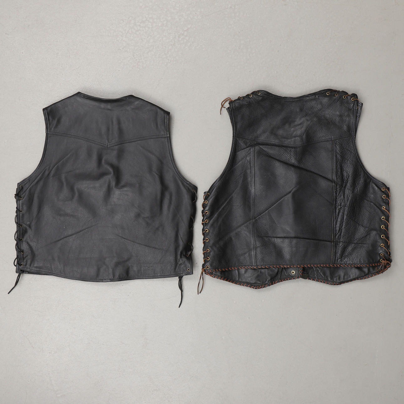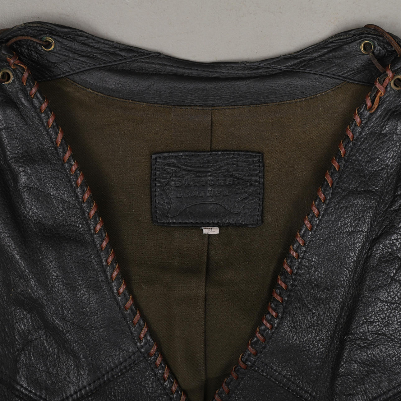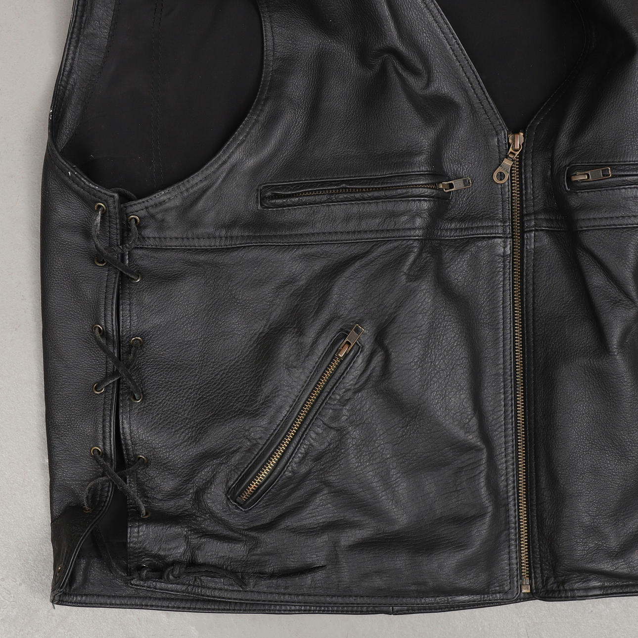 Merkinnät: "Daytona Leather" ja "4Bikers", nappi- ja vetoketjukiinnitys, sivuilla nauhat.