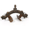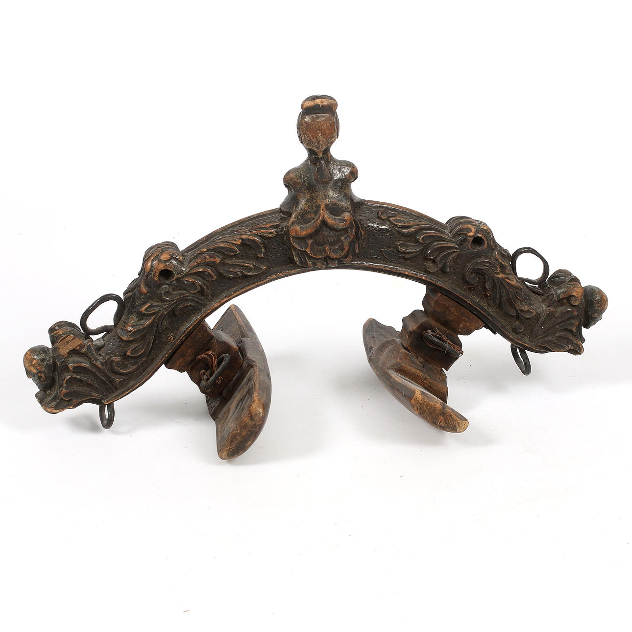 Maalattu kovapuu. Leikattu koristelu akantuksen lehtien, naamion ja kruunaavan hahmon muodossa. Taotut valjaiden silmukat ja ruuvit. Pituus n. 49, leveys 19, korkeus 27 cm.