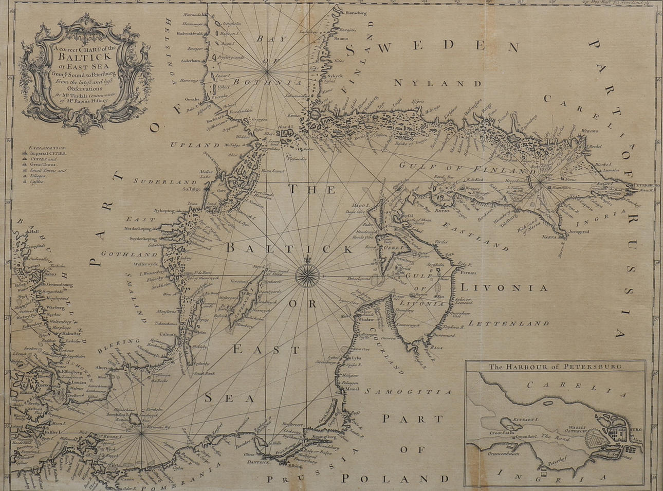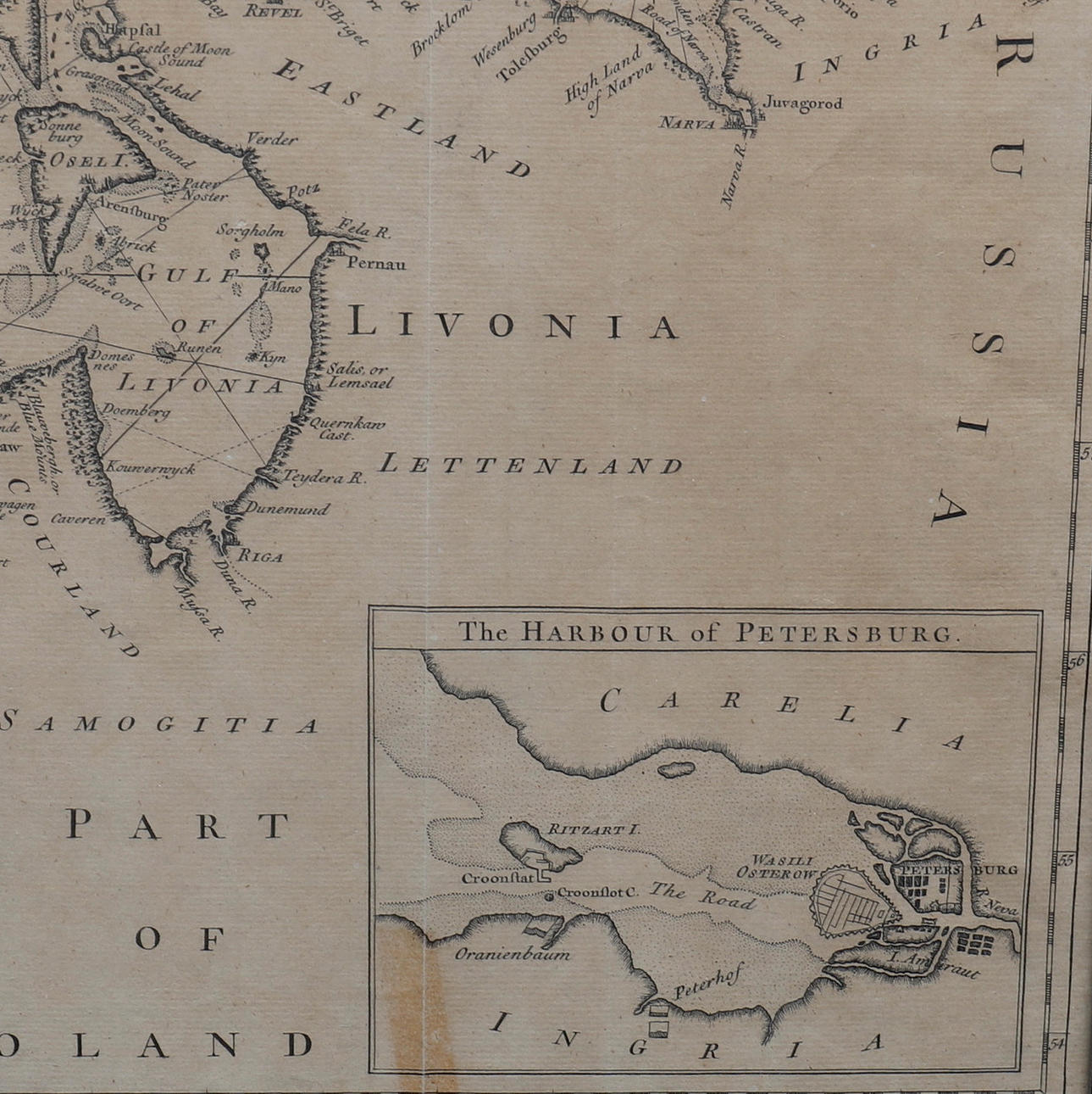 Seale, RW Oikea kartta Itämerestä tai Itämerestä Soundista Pietariin. Lontoo, 1743. Kehystetty mustavalkokuparikaiverrus Itämerestä ja Itämerestä Pietarin satama upotettuna alapuolella. Kehystetty ja mitat rungossa n. 42 cm. x 52,5 cm, lautasessa n. 38 cm. xx 49 cm.