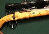 Laminaattihirsi. Ramppitähtäin. Laajennettu lippusulake. Alkuperäinen kiikarikiinnitys Leupold 3-9x40 asennettuna. Alkuperäinen hihna.