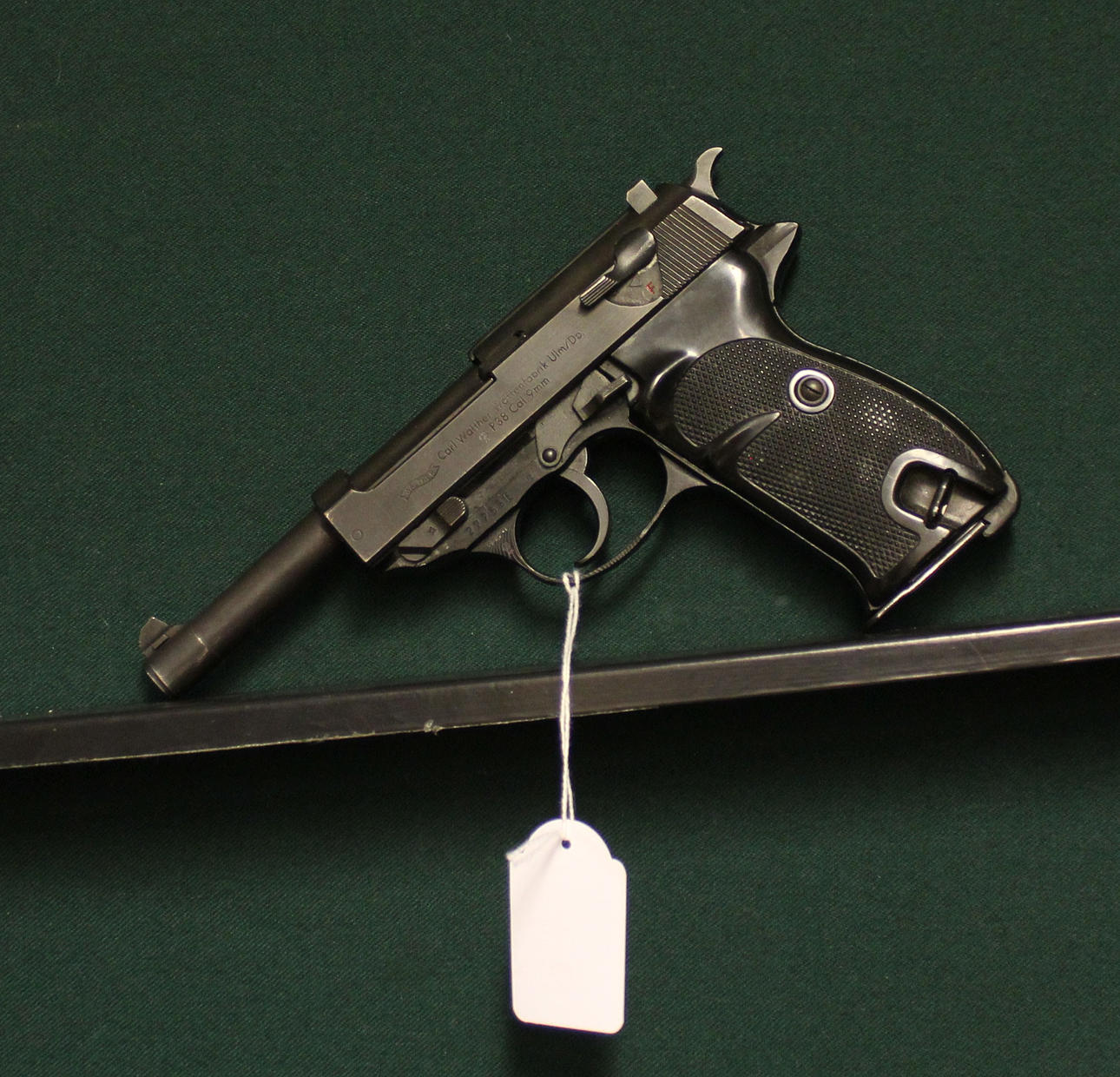 Saksalainen puoliautomaattinen pistooli. Tee Walther Ulm Mod. P38. Kaliiperi 9x19. Viitenumero. 22763E. Nokan pituus 12,5 cm. Kiinteä näkö. Irrotettava lehti. Männän sivut bakeliittia.