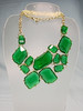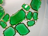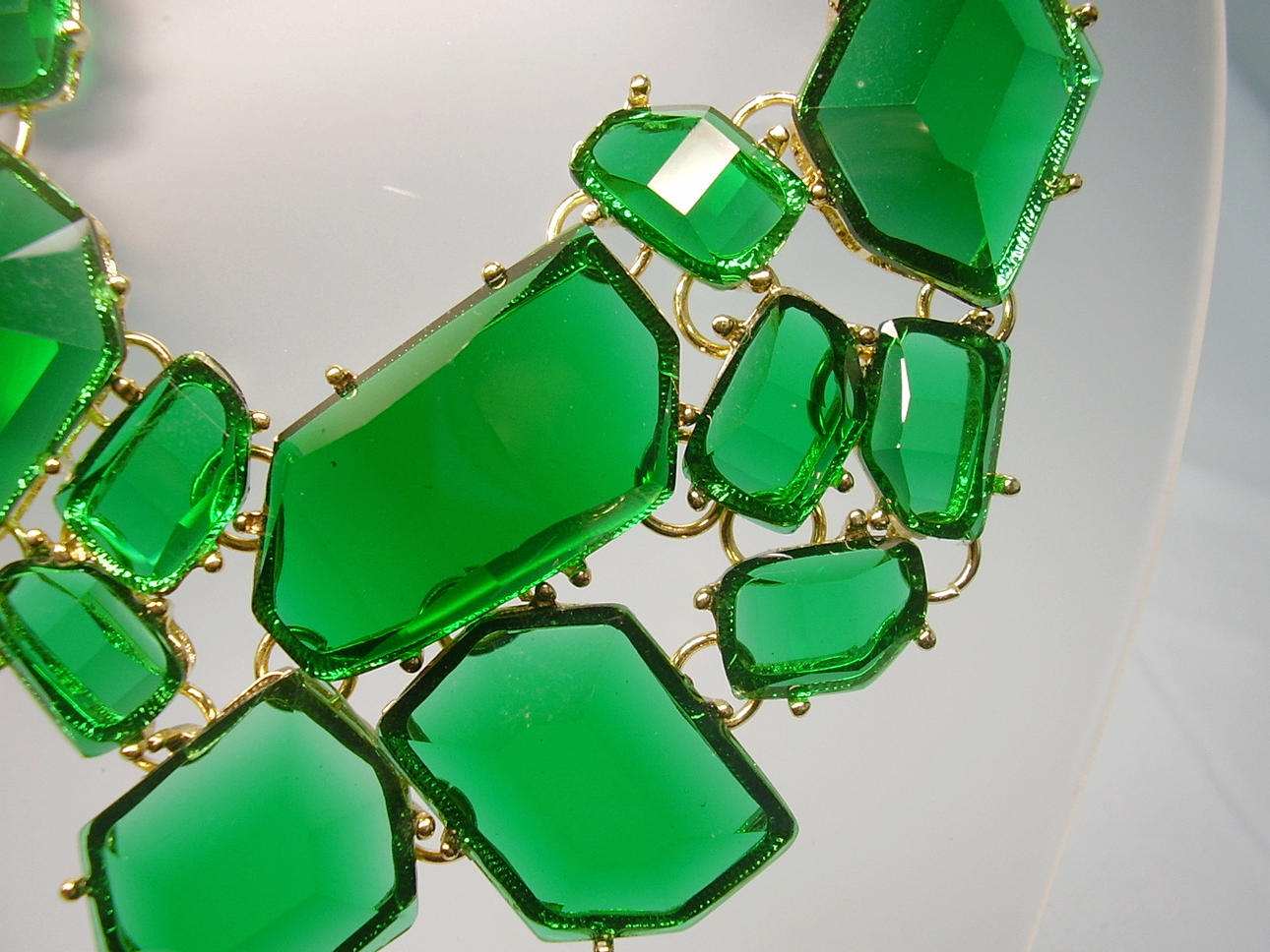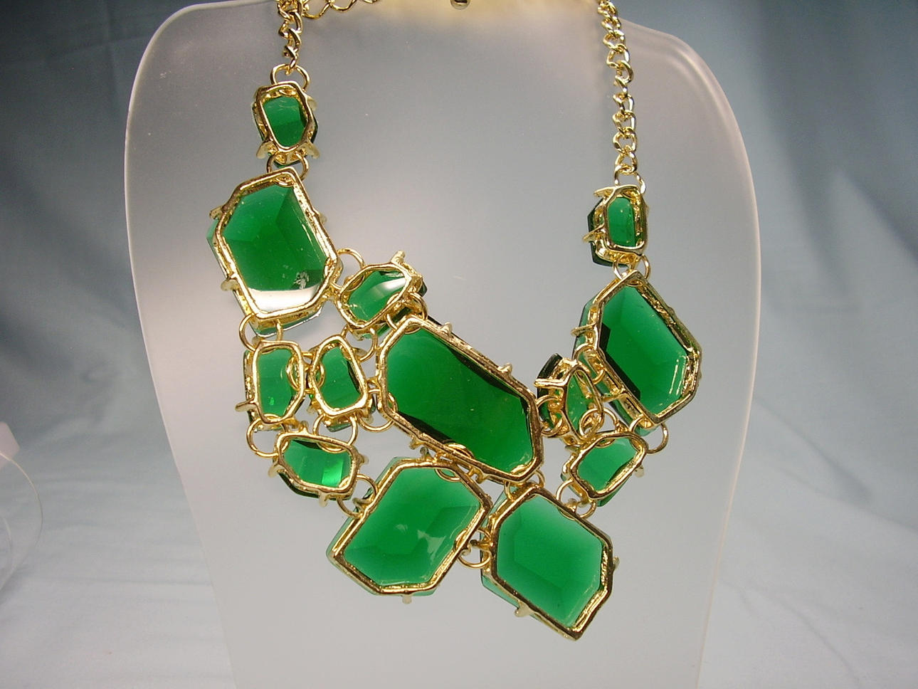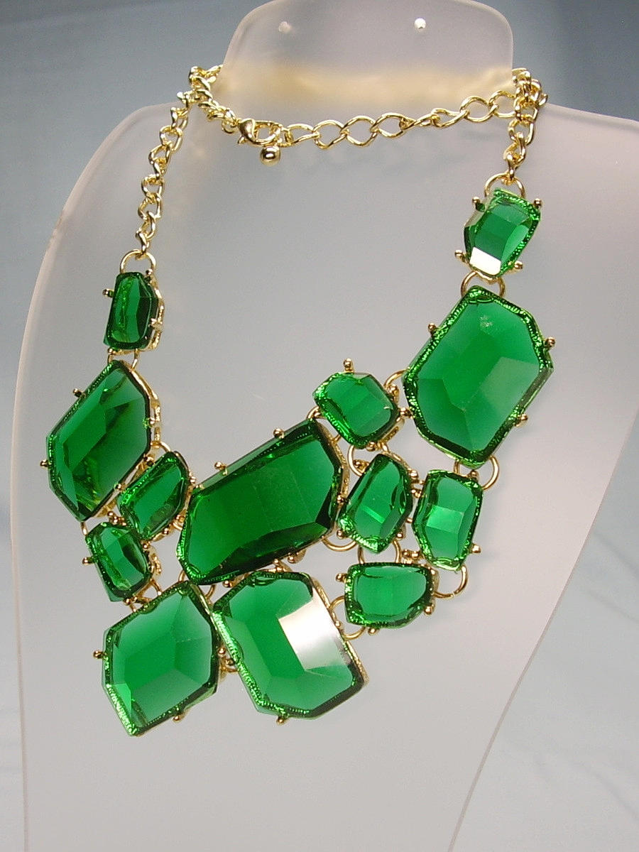 Kaulakorussa on yksittäin asetettuja suuria smaragdinvihreitä bakeliitti-/galaliitti-/muovikiviä poikkeavissa muodoissa.