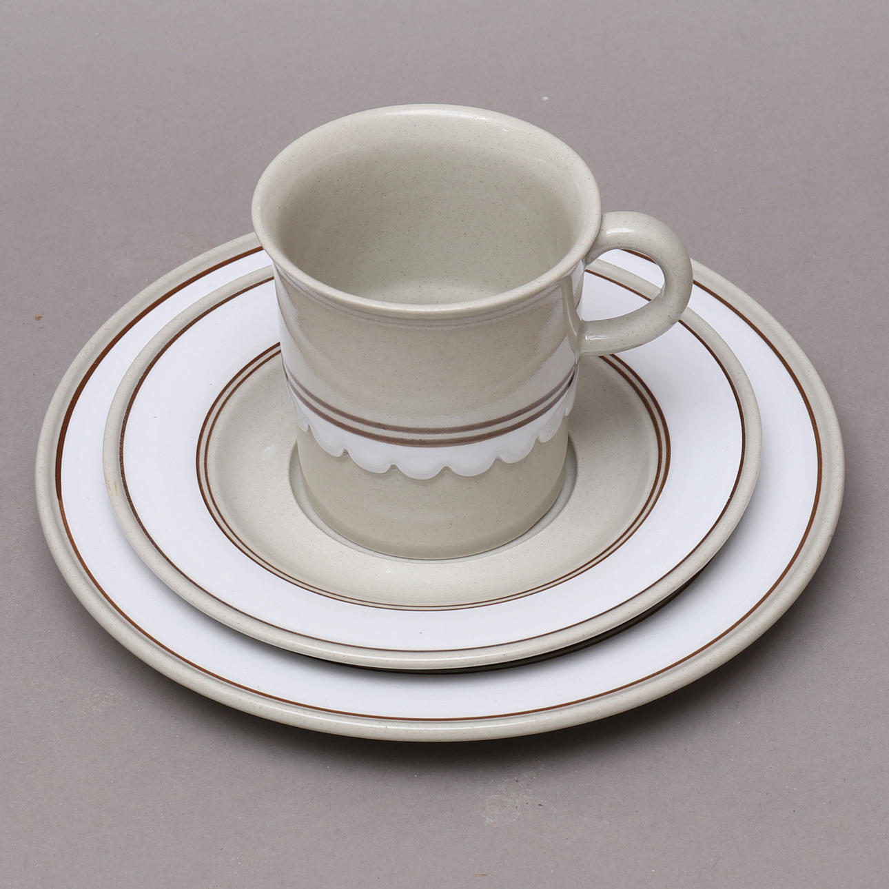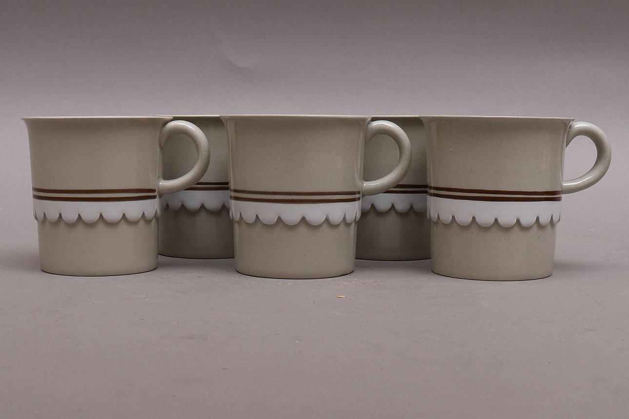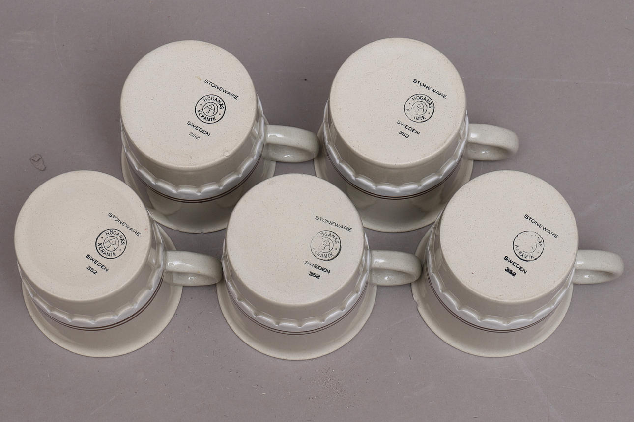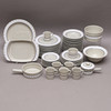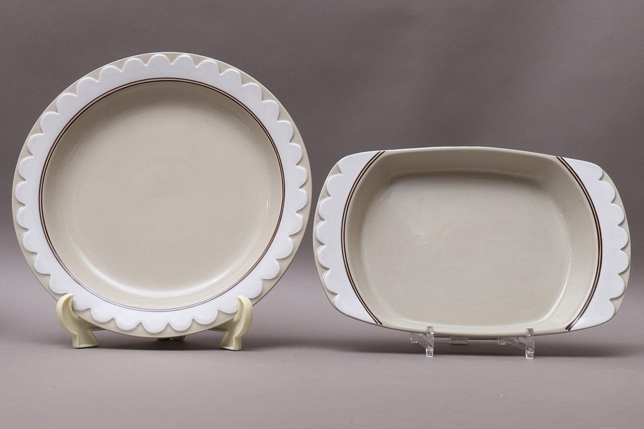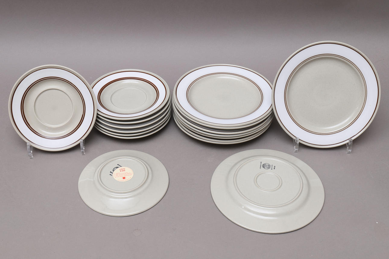 15 lautasta, halkaisija n. 25,5 cm 16 syvää lautasta, halkaisija n. 21 cm 9 lautasta, halkaisija n. 20 cm 8 lautasta, halkaisija n. 16,5 cm 5 kuppia, korkeus n. 8,5 cm Kermakannu korkeus n. 8 cm Sokeri kulho, korkeus n. 6,5 cm Porkkana, pituus n. 26 cm Kansi kannella, pituus n. 19 cm Kulho, suorat sivut, korkeus n. 9,5 ja pituus 18 cm Kulho, vinot sivut, korkeus n. 10 cm ja 23 cm cm pitkä Pyöreä tarjoilulautanen, halkaisija n. 31 cm Soikea vati, pituus n. 33 cm.