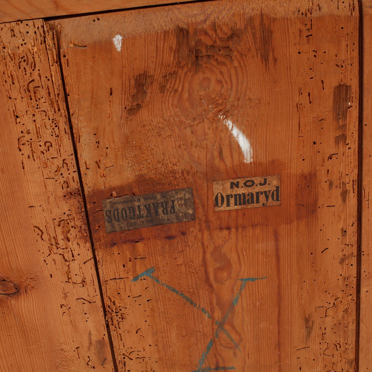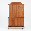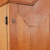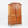 Tammi upotuksilla koristeltu. 6 laatikkoa ja hyllysisä pariovien takana. 117 x 44 cm, korkeus 176 cm.