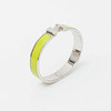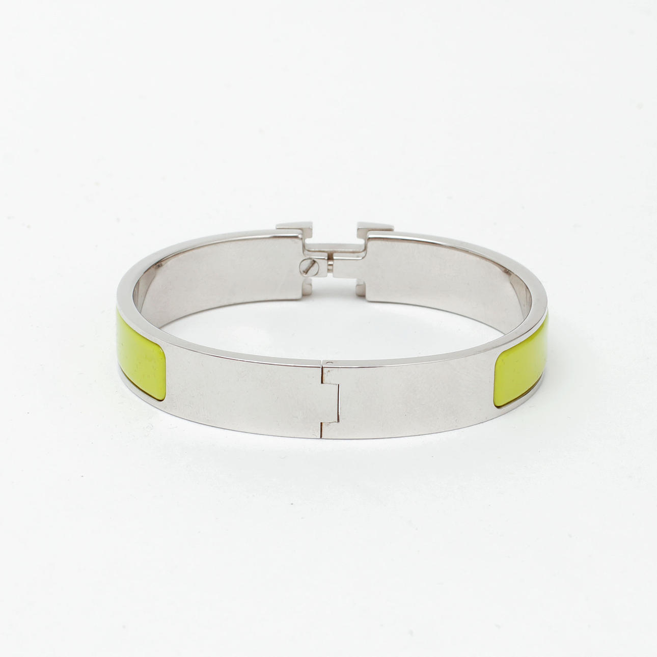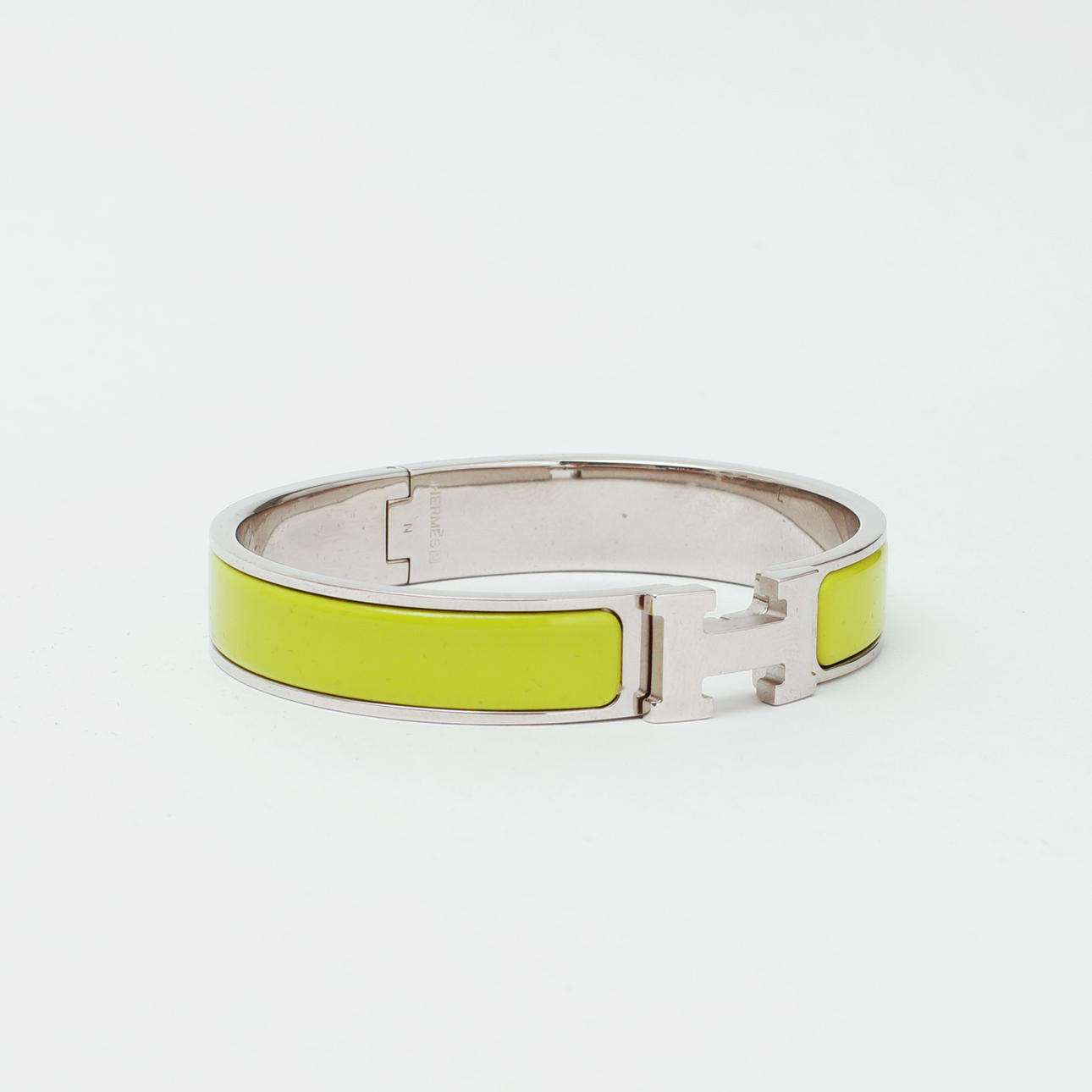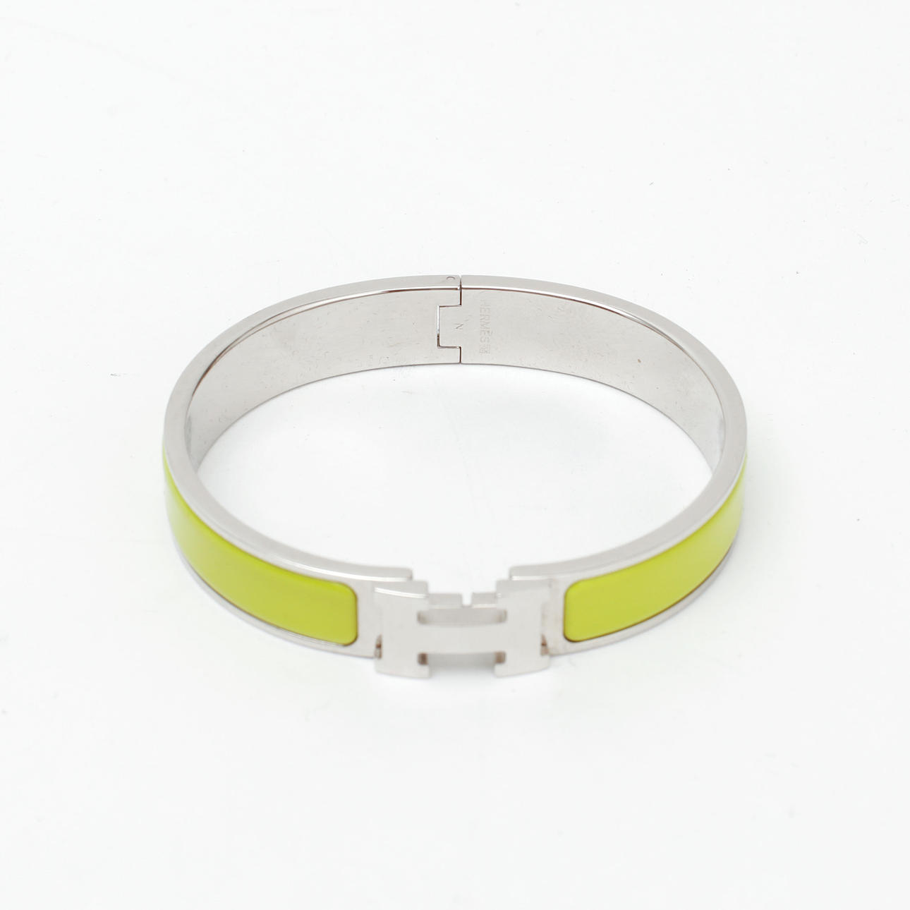 Rannekoru hopeanväristä metallia vihreällä emalilla. H-kirjaimen muotoinen solki, sarana. Merkitty "HERMÈS" ja "M". Sisäleveys n. 5,9 cm. Minä kysyn.