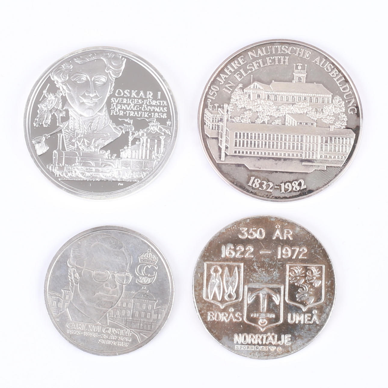 Ruotsin kuningaskunta, "Oskar I, Ruotsin ensimmäinen liikenteelle avattu rautatie vuonna 1856" halkaisija 36 mm Ruotsin kuningaskunta, "Carl XVI Gustaf 1973-1998, 25 vuotta valtionpäämiehenä" Halkaisija 30 mm Borås, 350 vuotta 1622-1972, Borås Norrtälje Uumajan leimattu TRACK , X9, kissan jalka, S Halkaisija 33 mm 150 jahre nautische ausbildung in Elsfleth 1832-1982, Segelschiff Grossherzogin Elisabeth, Dreimastschoner, Elsfleth 3 grammaa 198 mm2 4 mm.