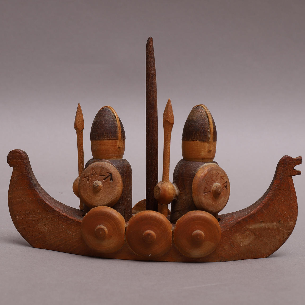 Viikinkien muotoiset suola- ja pippuripuristimet viikinkiveneessä.