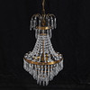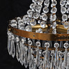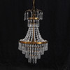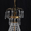 Keltaista metallia oleva kristallikruunu pidikkeellä 5 kynttiläälle. Korkeus: 52 cm Halkaisija: 50 cm.