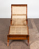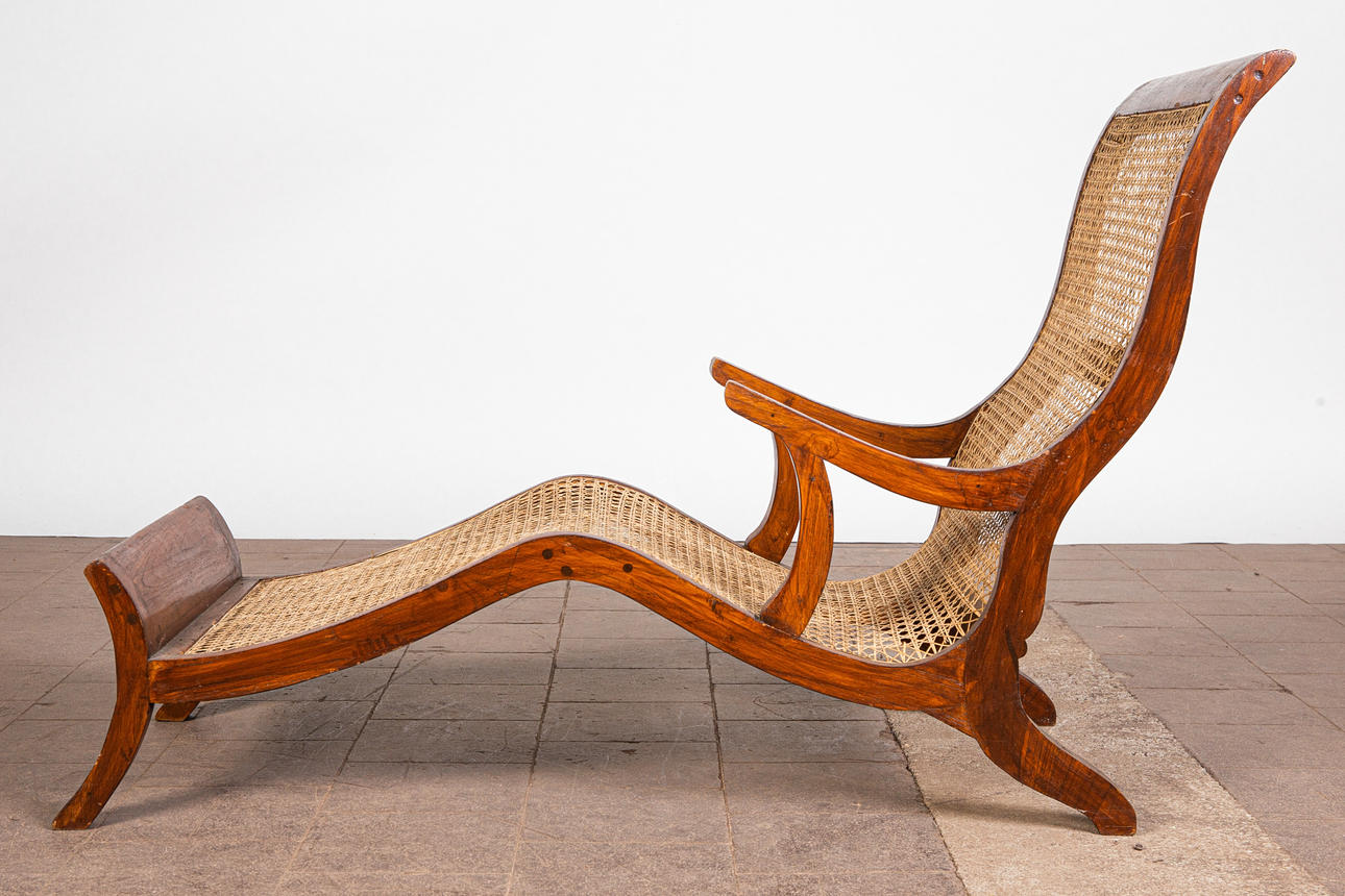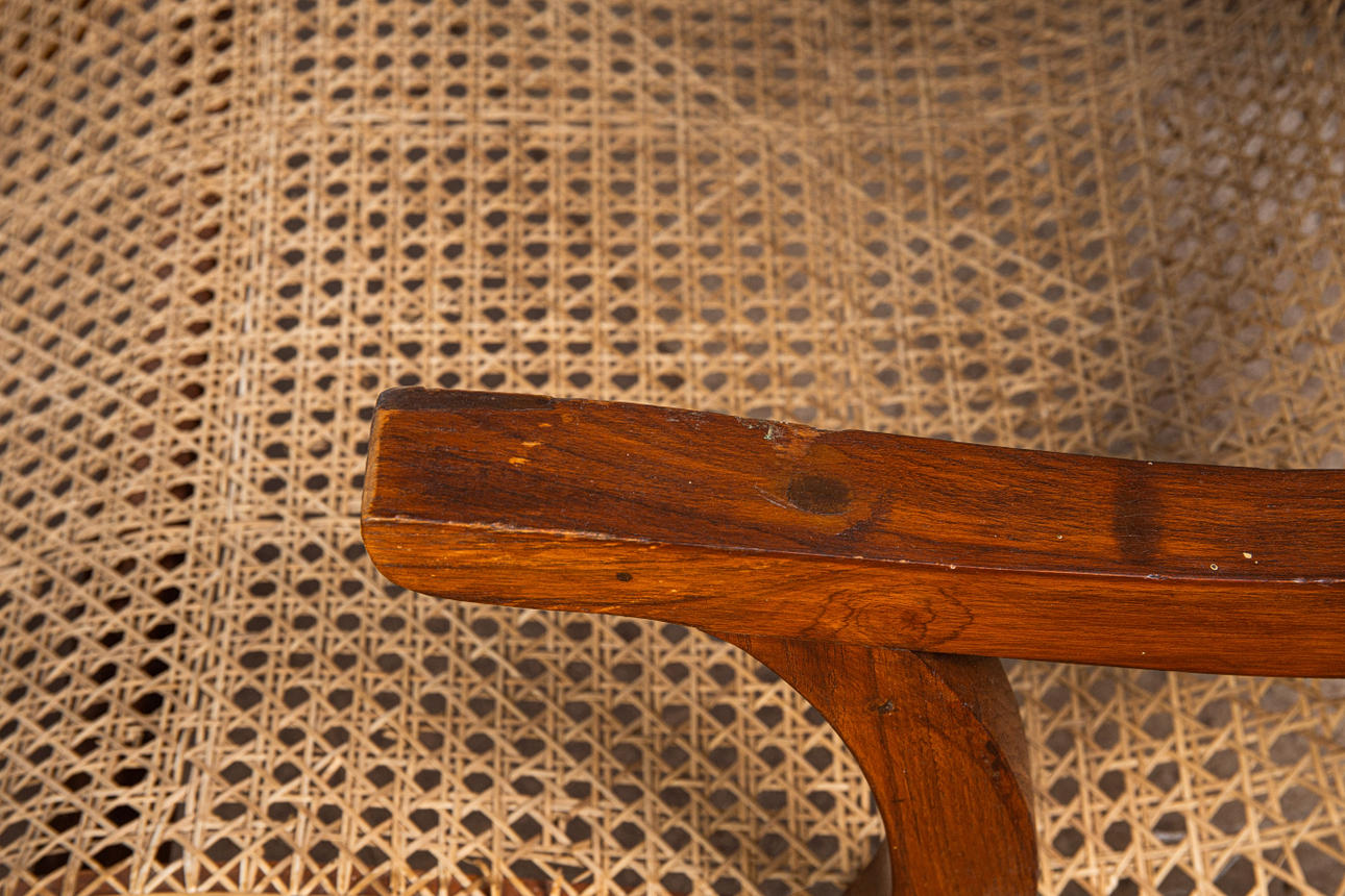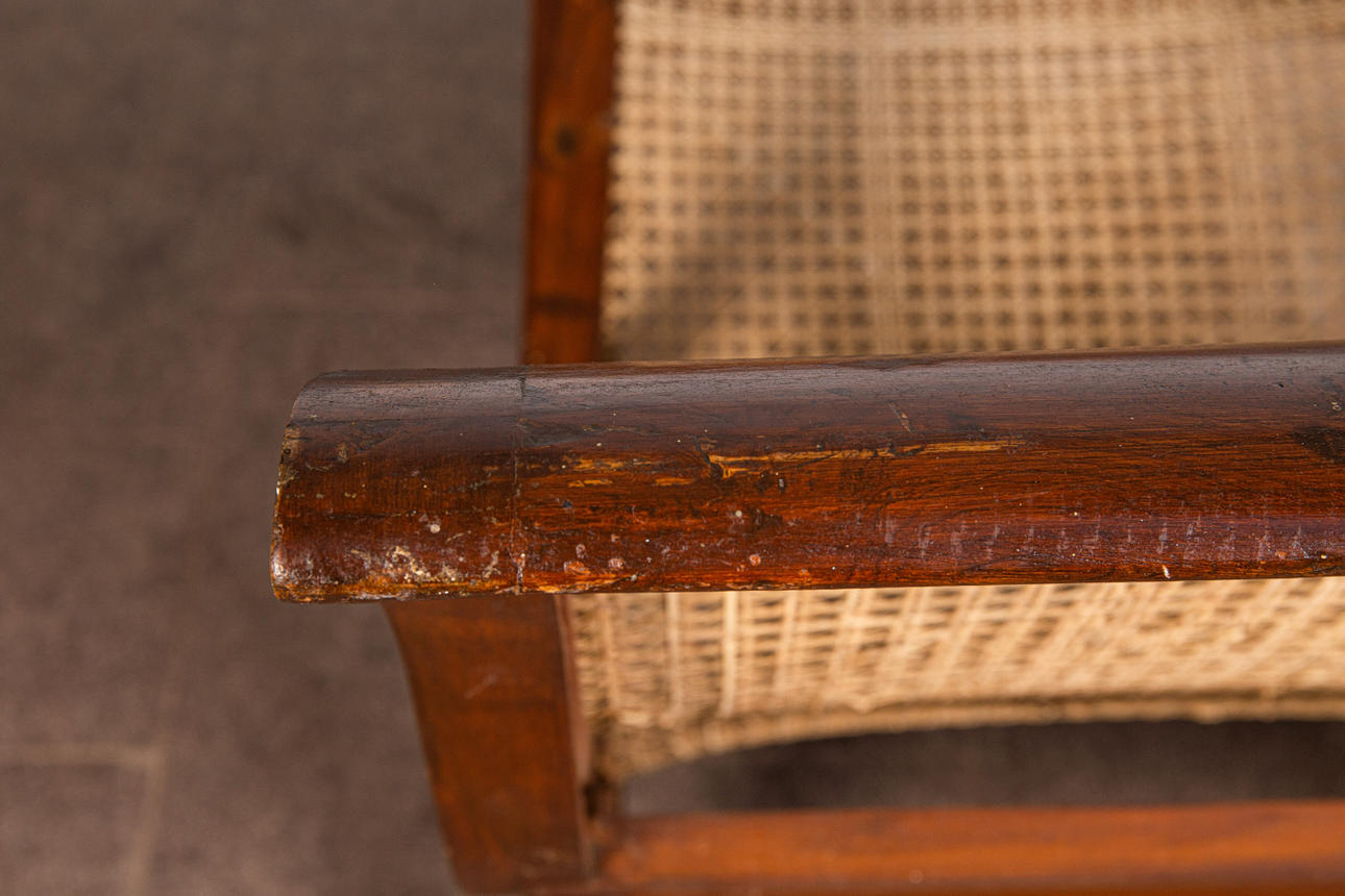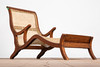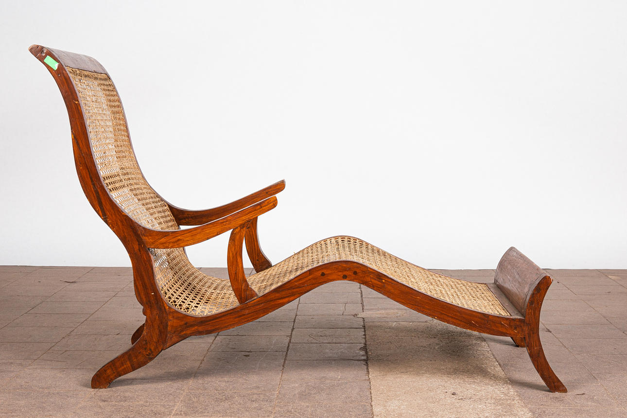 Lepotuoli / kansituoli, puu, rottinki. Puinen lepotuoli käsinojilla ja kaareva makuualusta päällystetty rottinkikudoksella, K.92,5cm, istuinkorkeus: 36cm, P.140cm, L.60cm.