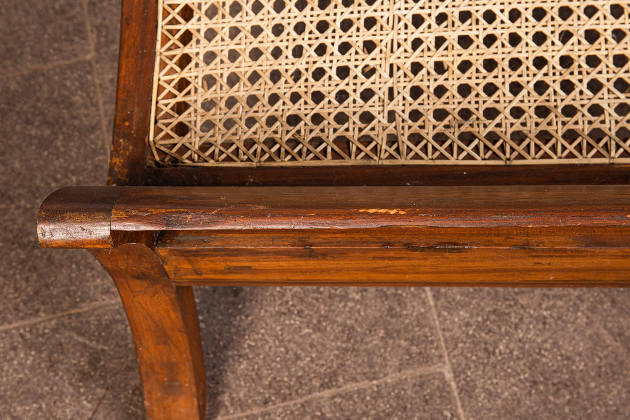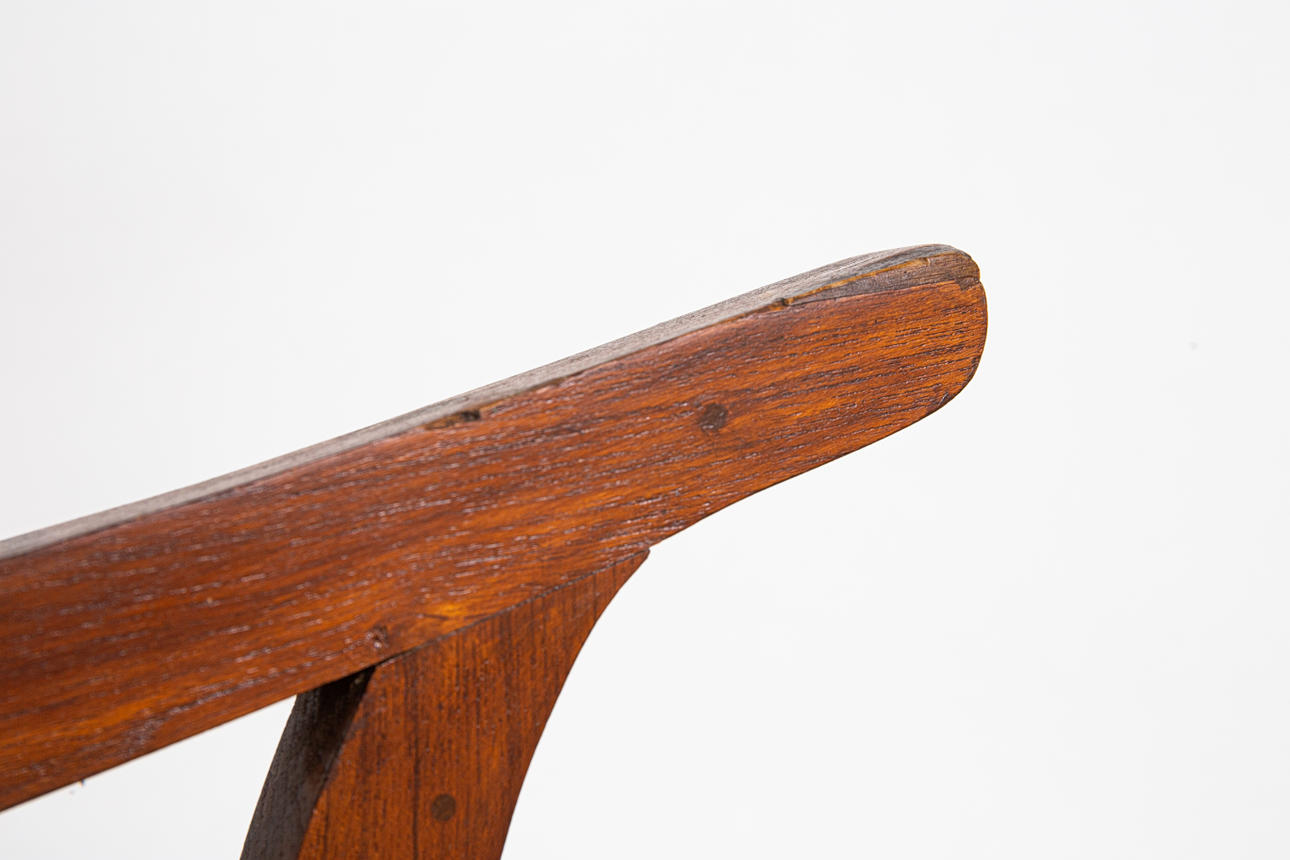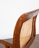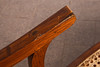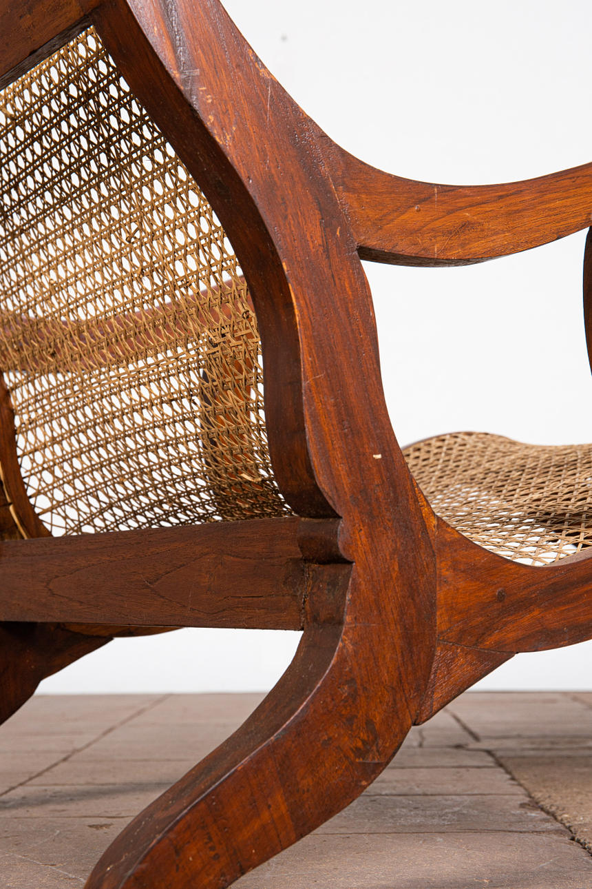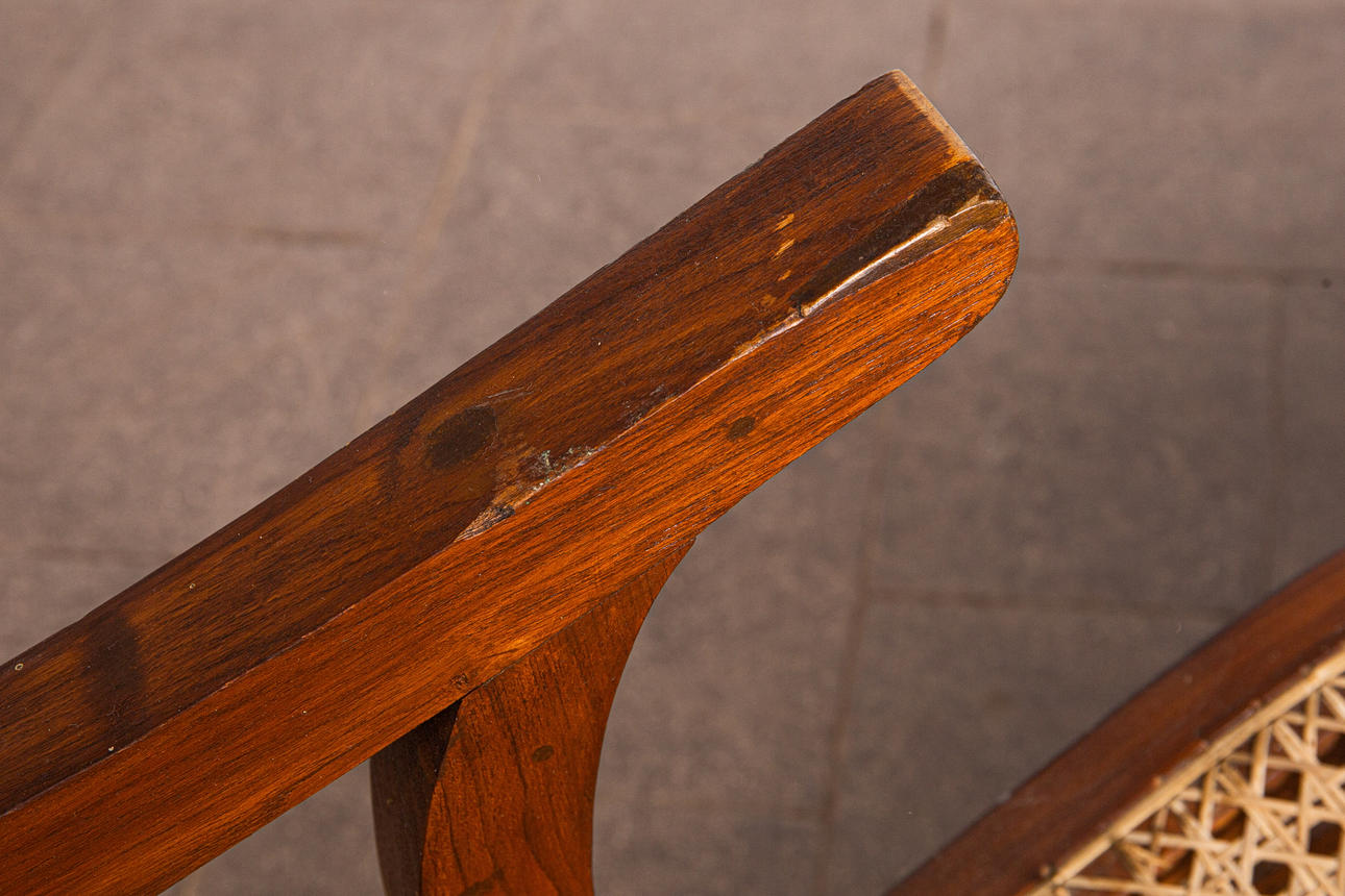 Lepotuoli / kansituoli, puu, rottinki. Puinen lepotuoli käsinojilla ja kaareva makuualusta päällystetty rottinkikudoksella, K.92,5cm, istuinkorkeus: 36cm, P.140cm, L.60cm.