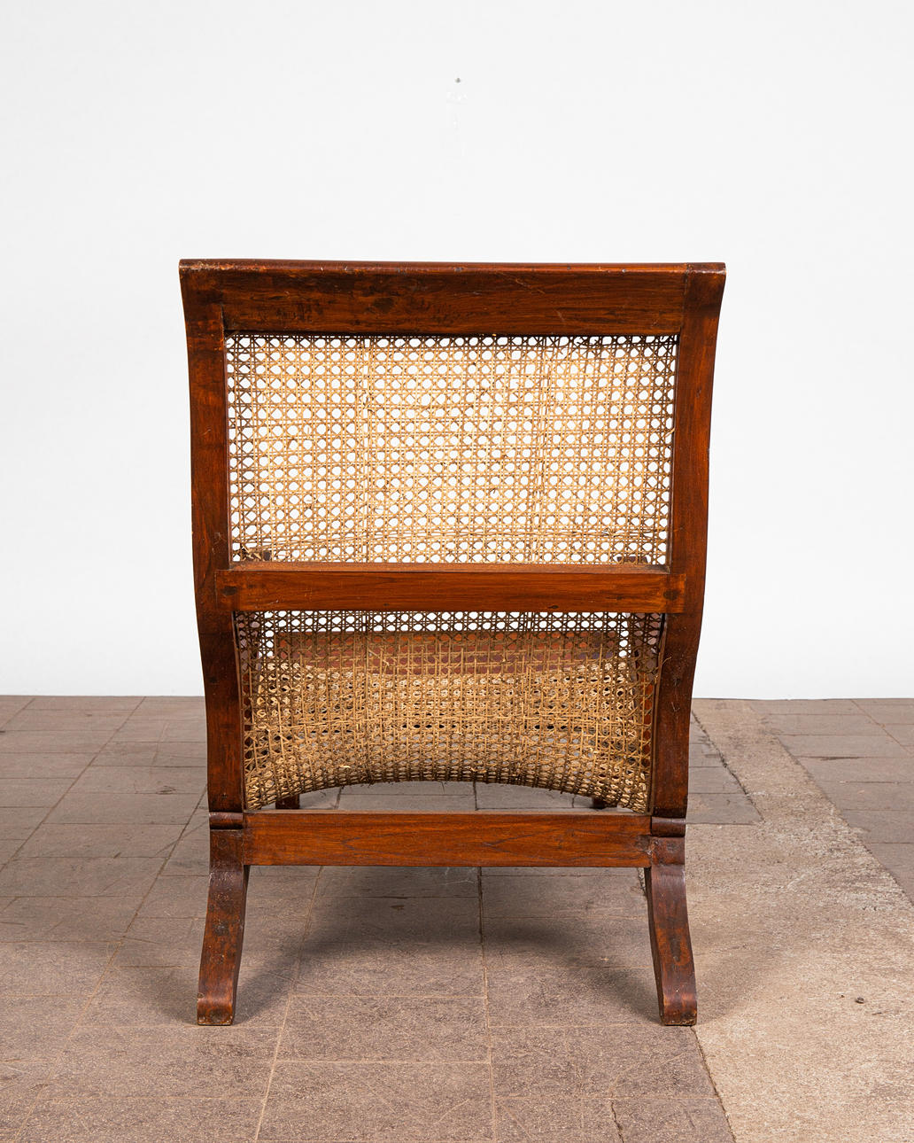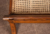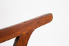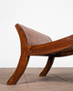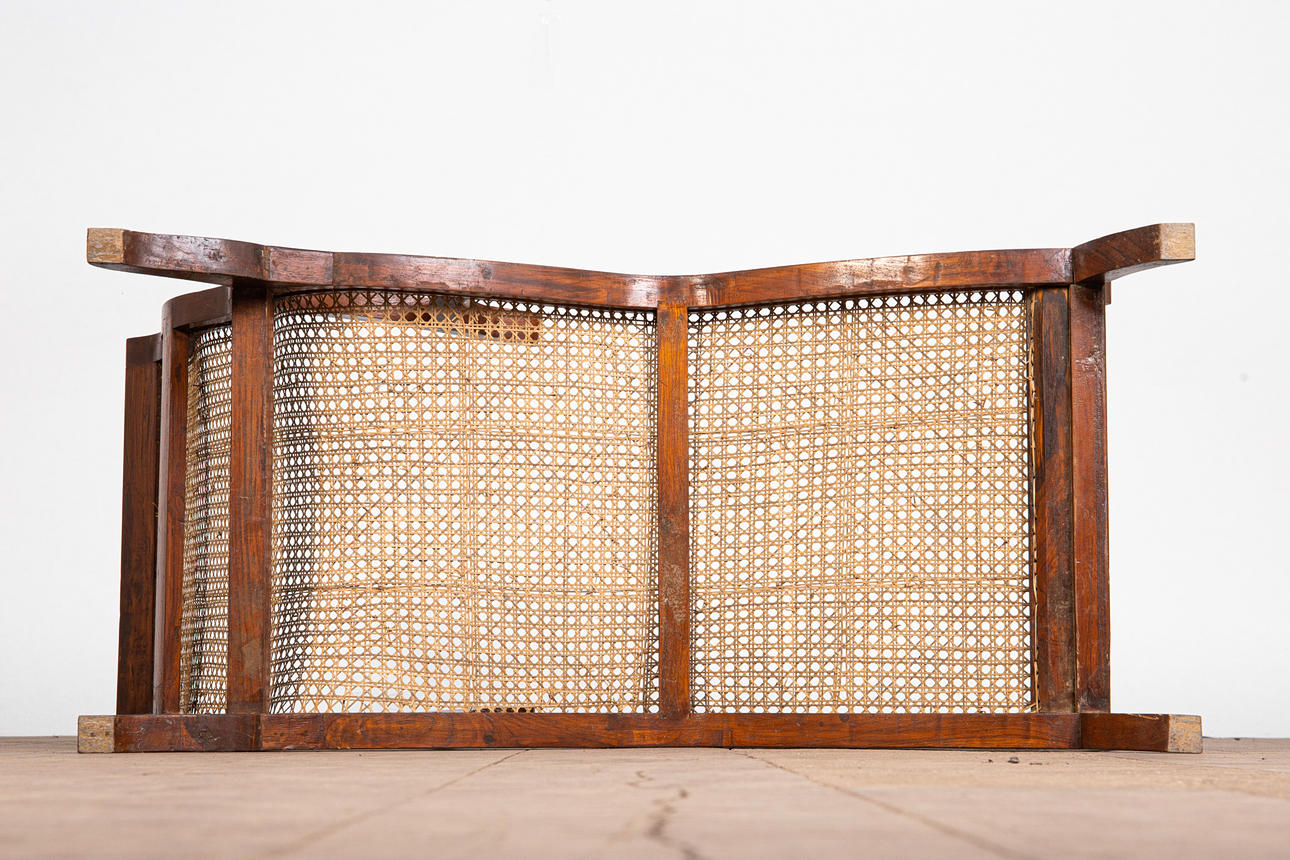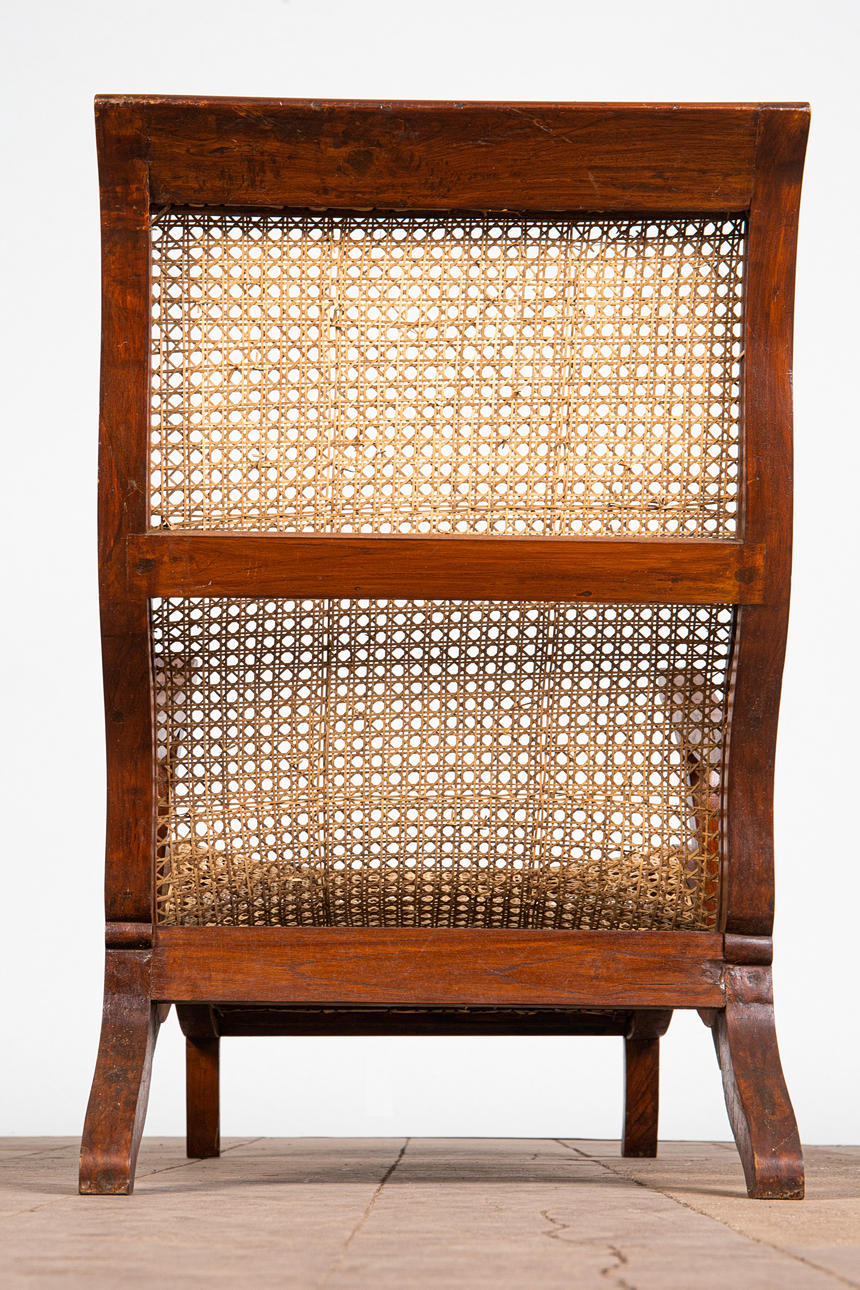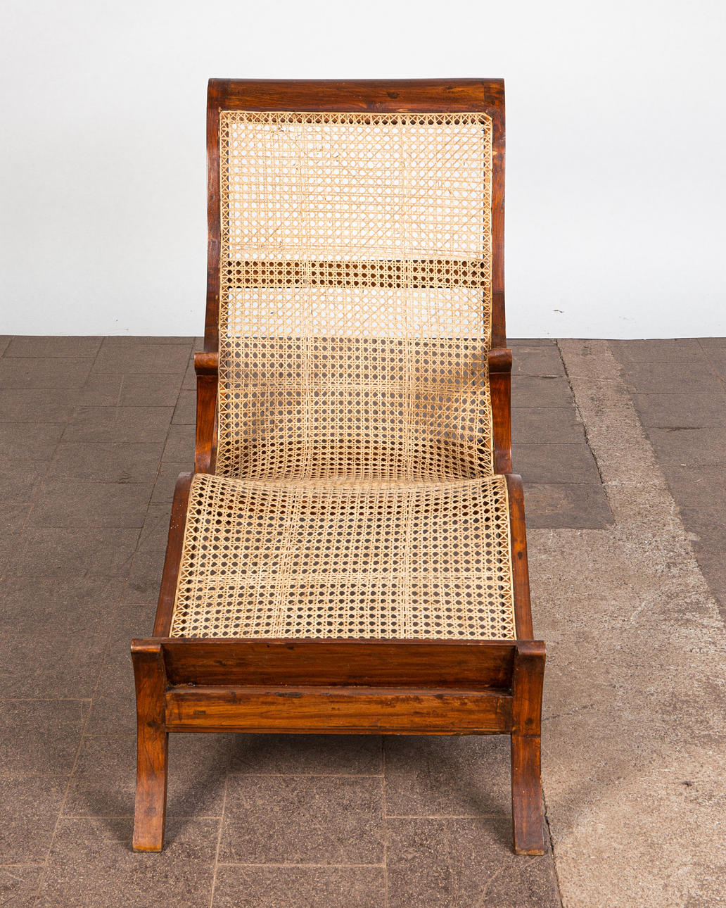 Lepotuoli / kansituoli, puu, rottinki. Puinen lepotuoli käsinojilla ja kaareva makuualusta päällystetty rottinkikudoksella, K.92,5cm, istuinkorkeus: 36cm, P.140cm, L.60cm.
