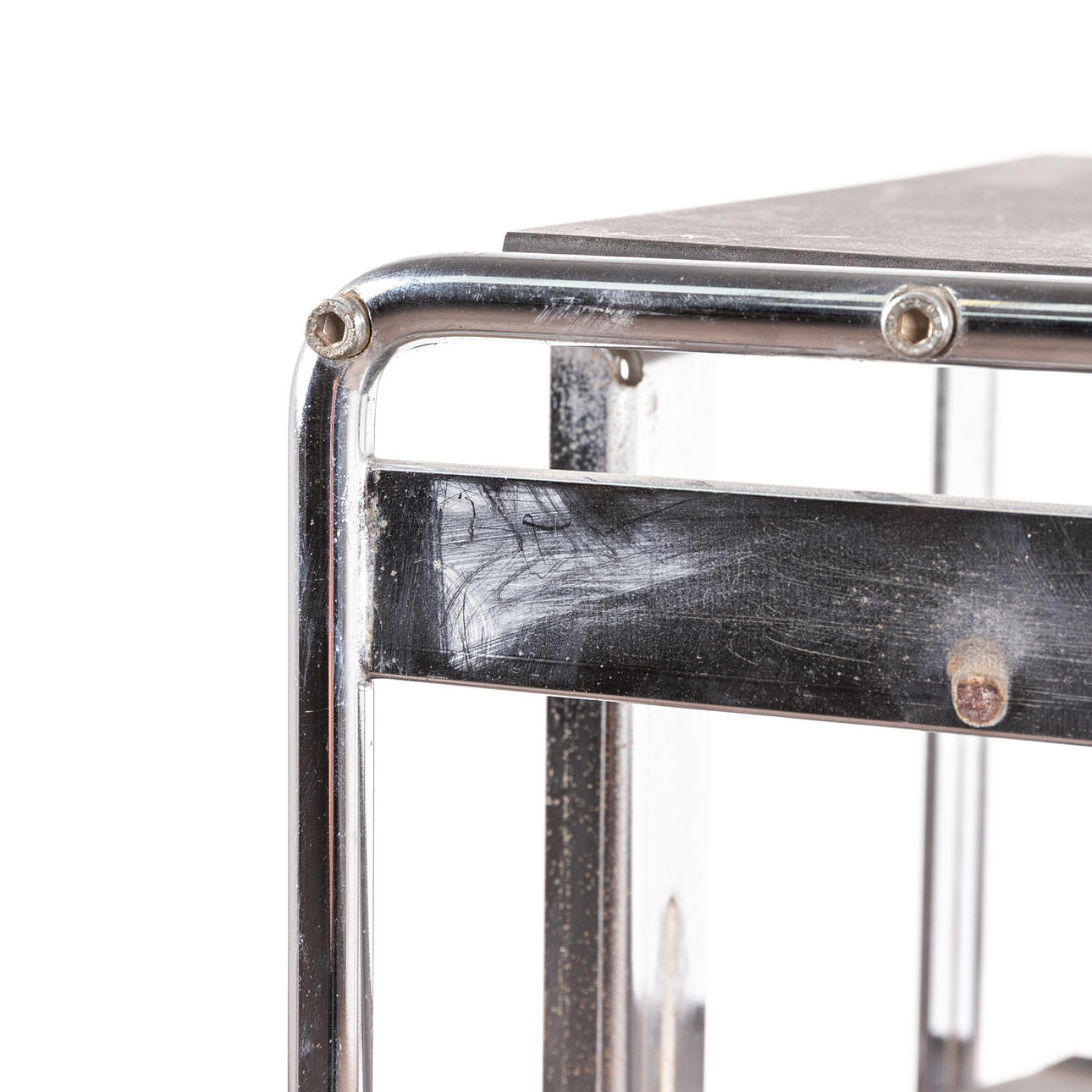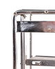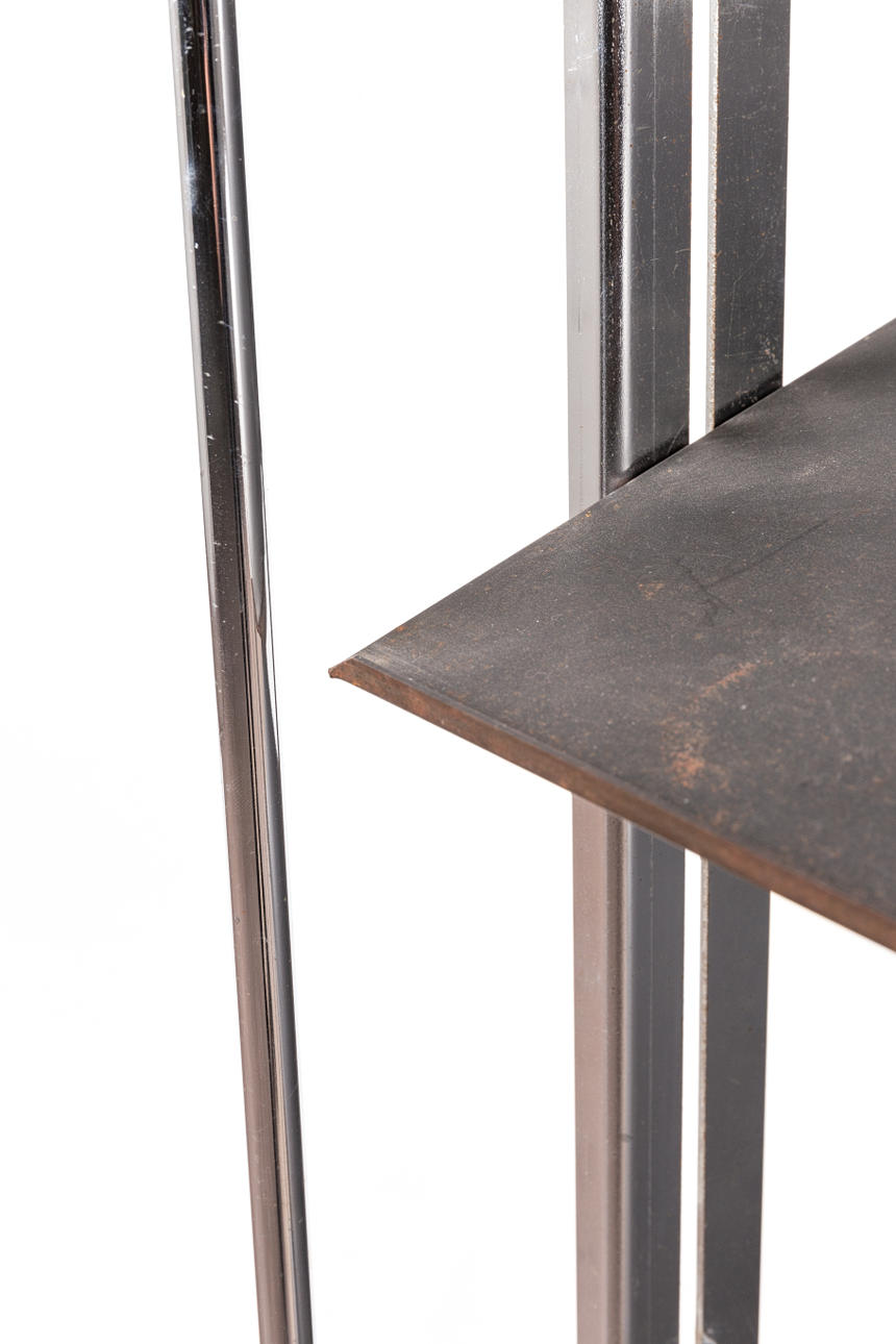 Hylly, metallia, kromattu. Suorakaiteen muotoinen hylly kromattua putkimaista metallia ja kolme metallilevyhyllyä, molemmissa hyllyissä kaksi ruuvia ja neljä koloa molemmilla puolilla kulman ja korkeuden säätöä varten, K.94cm, L.51cm, S.42cm.