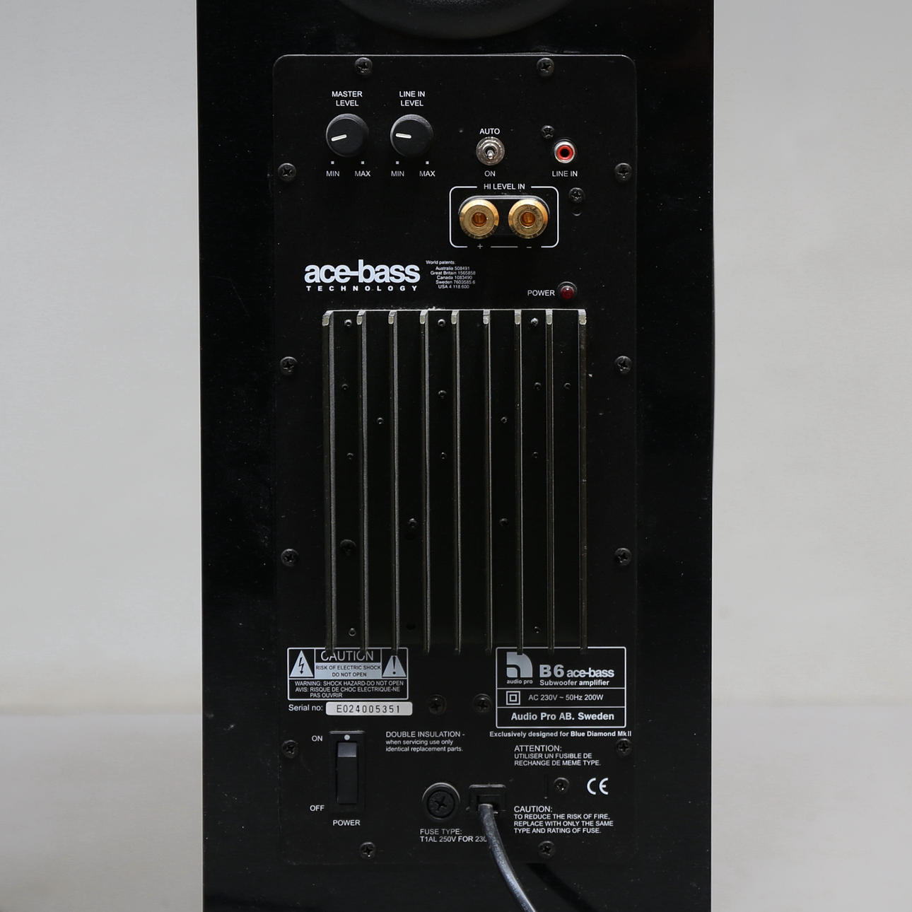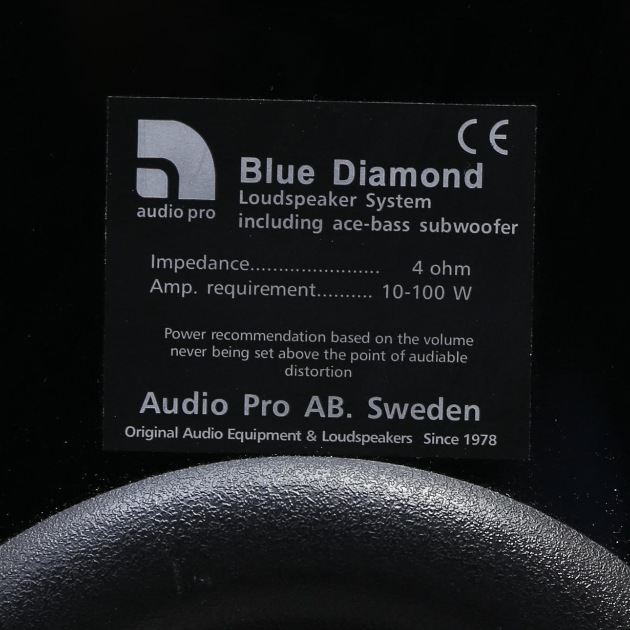 Audio Pro Blu Diamond -etukaiutin, kolmitiekaiutin 3/4" diskanttikaiuttimella, 61/2" keskitaajuus, aktiivinen Ace-Bass Subwoofer 10", 150 W, taajuusalue: 18-22 000 Hz, korkeus = 100, leveys = 26 , syvyys = 43 cm, paino = 27,4 kg.