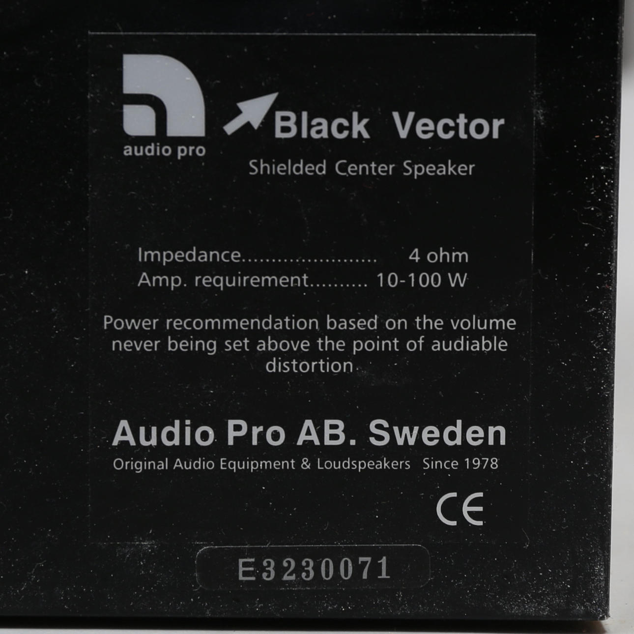 Audio Pro Black Vector keskikaiutin, bassorefleksi, diskantti 3/4, kaksi 6 1/2 keskitaajuutta (yksi niistä on passiivinen), taajuusalue 34-22 000 Hz, korkeus = 18, leveys = 52, syvyys = 26 cm, paino = 6,8 kg.