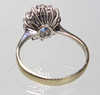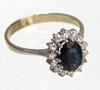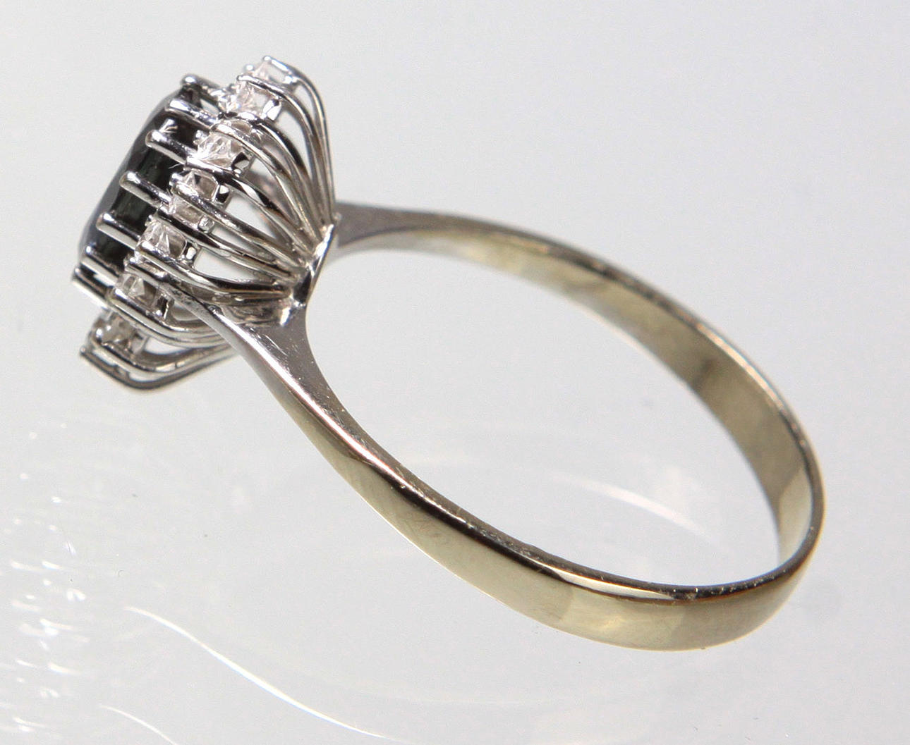 leimattu valkokulta 585 (14 karaattia), n. 3,1 grammaa, hieman kohotettu soikea rengaspää n. 12,9 x 11 mm, keskiyönsininen safiiri n. 7,8 x 5,9 mm ovaalihiottu, yhteensä 14 briljanttihiottua timanttia 0,29 ct., sormuskoko 58, sisä-Ø n. 18,5 mm.