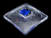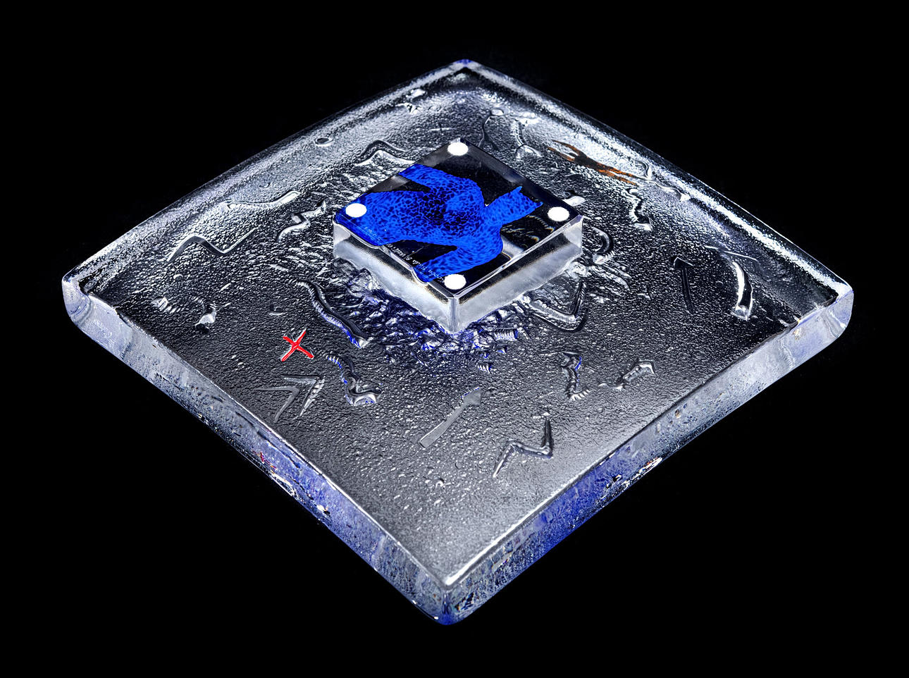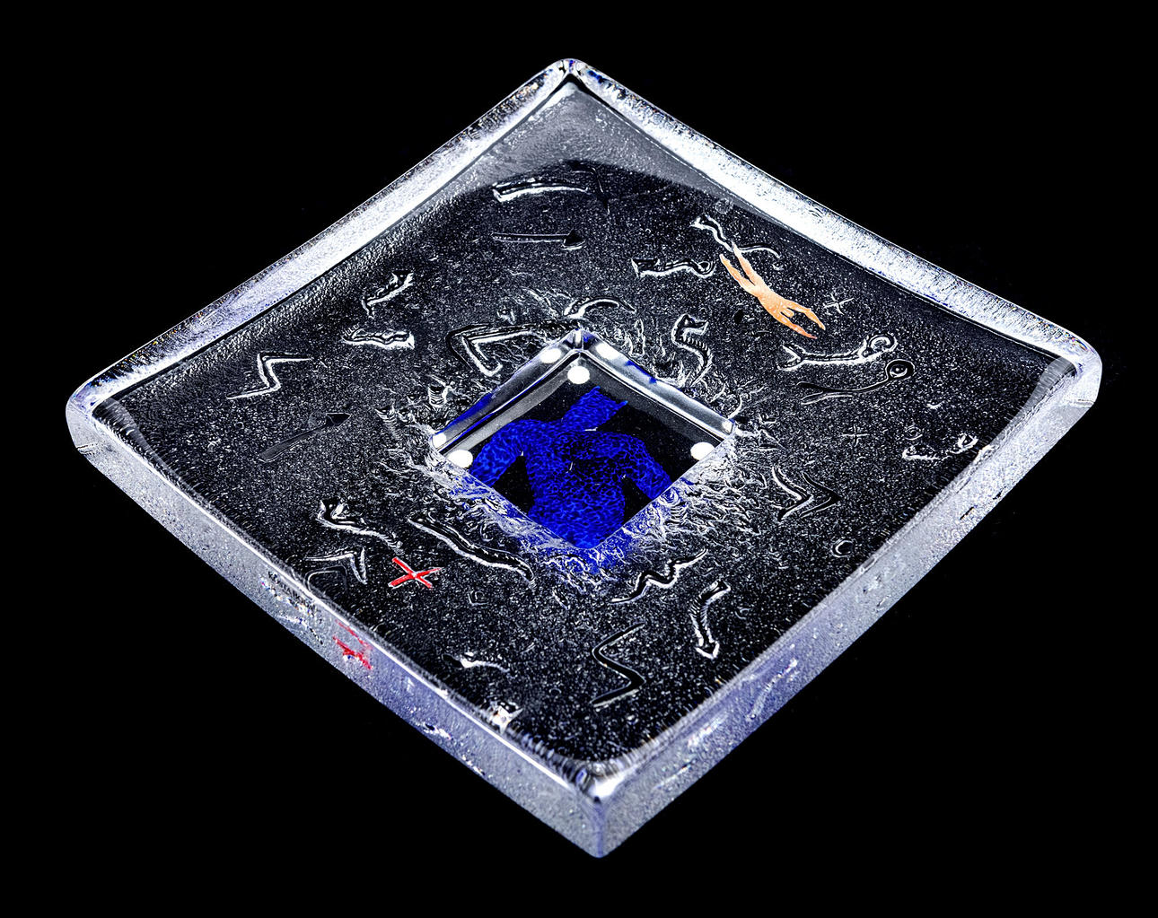 koristeellinen kohokuvio ja mukana sininen hahmo. Signeerattu "Kosta Boda B.Vallien 79367". pituus 22 cm, leveys 22 cm, korkeus 5,5 cm.