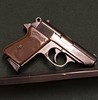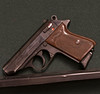 Saksalainen puoliautomaattinen pistooli. Tee Walther (Ulm) Mod. PPK. Kaliiperi 7.65. Viitenumero. 253157- Nokan pituus 8,5 cm. Kiinteä näkö. Männän reunat bakeliittia. Mukana 1 ylimääräinen lehti ja numeroitu alkuperäinen laatikko.