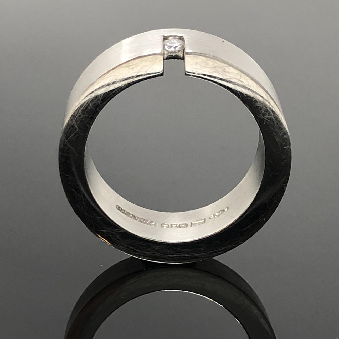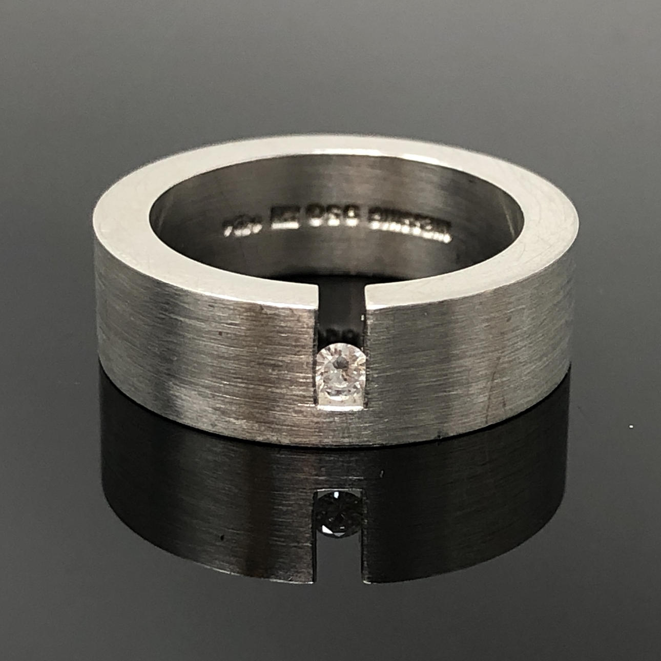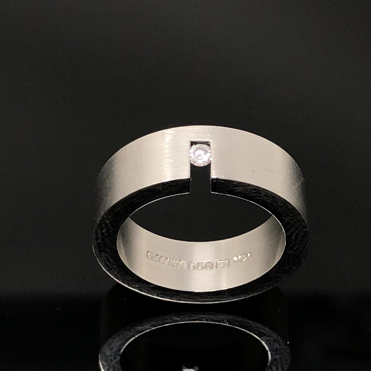 Niessingin sormus, malli: catwalk. Valmistettu 950 platinasta (leimattu), sarja briljantti 0,06 ct. Väri: Wesselton (H), kirkkaus: SI. Sormuksen koko: 54, halkaisija: 14 mm. Leveys: 7mm. Paino: 21,4g.