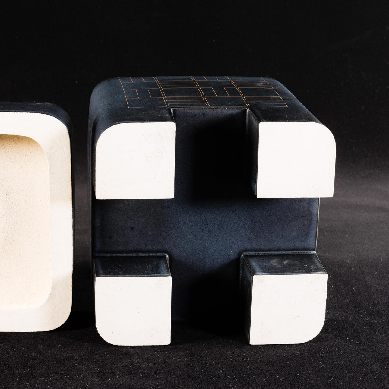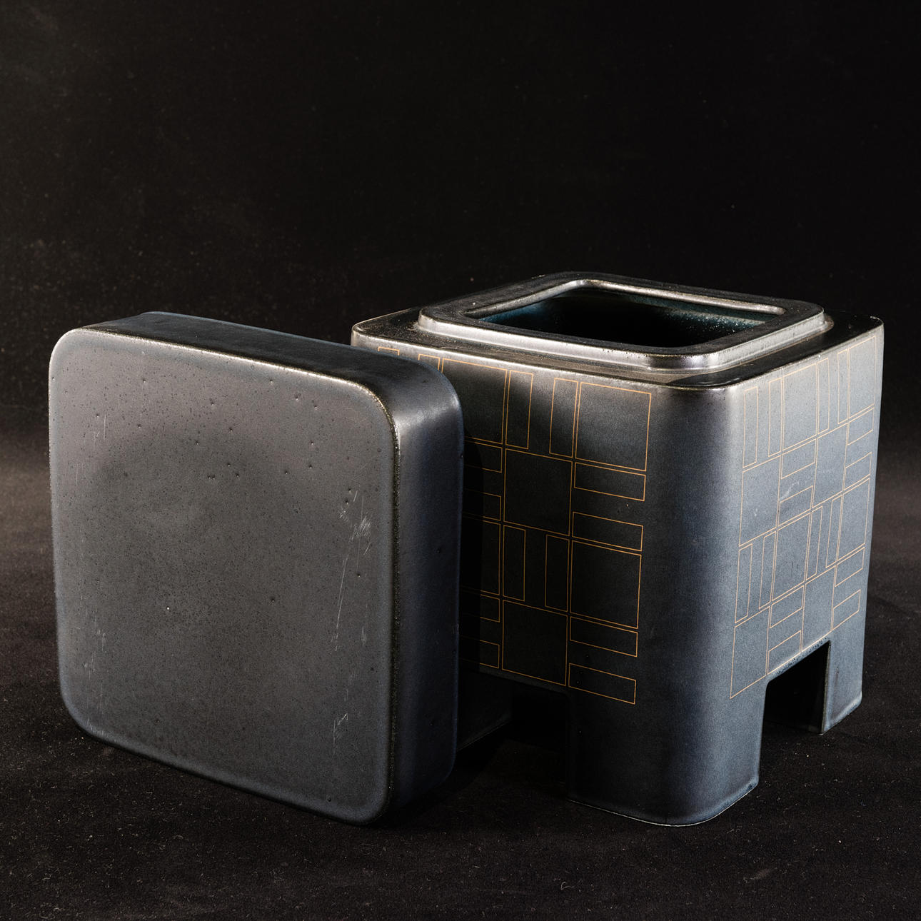 kannellinen uurna, lasitettua kivitavaraa, neljällä sivulla värikenttiä. Arabia 1980-luku, noin 27x21,5x21,5 cm.