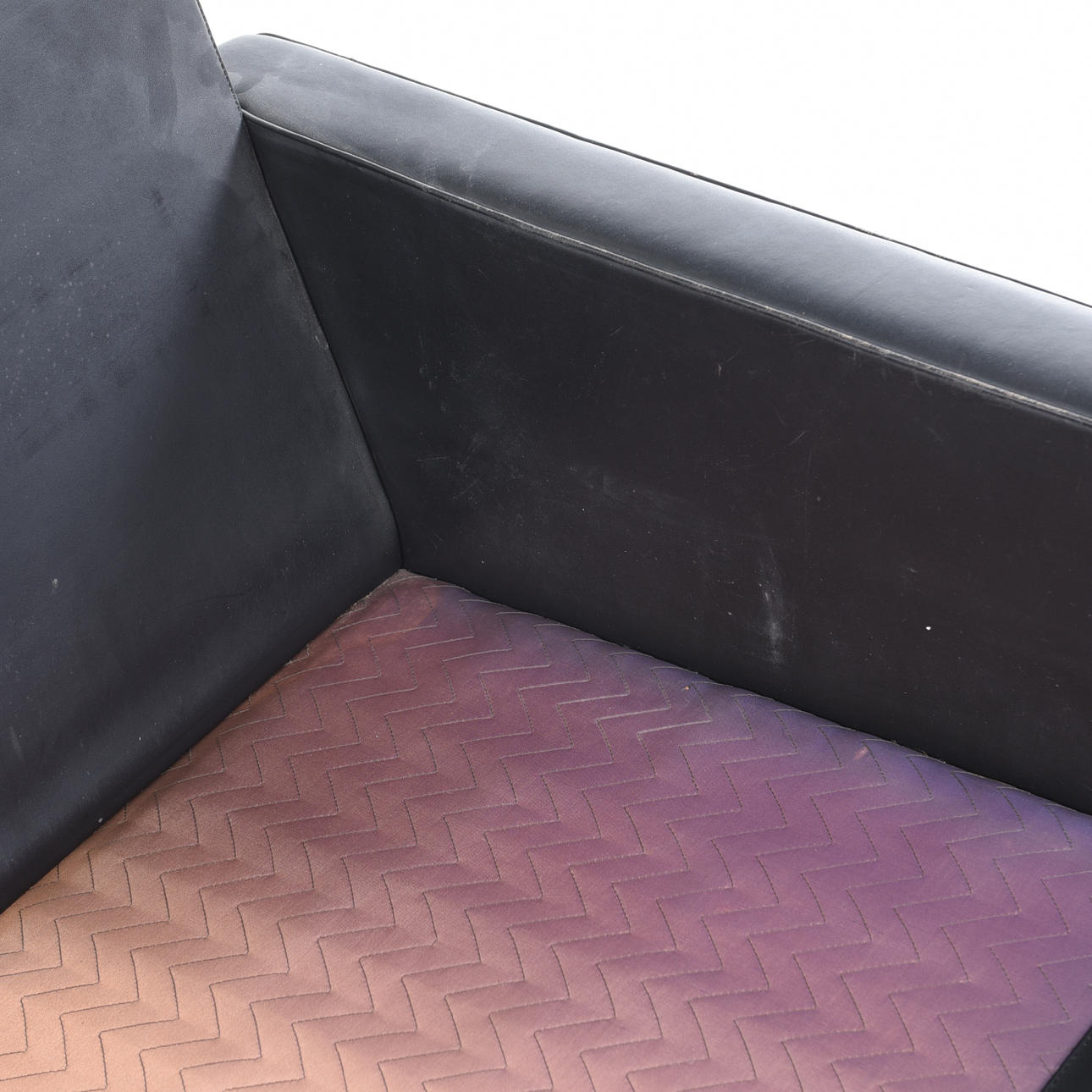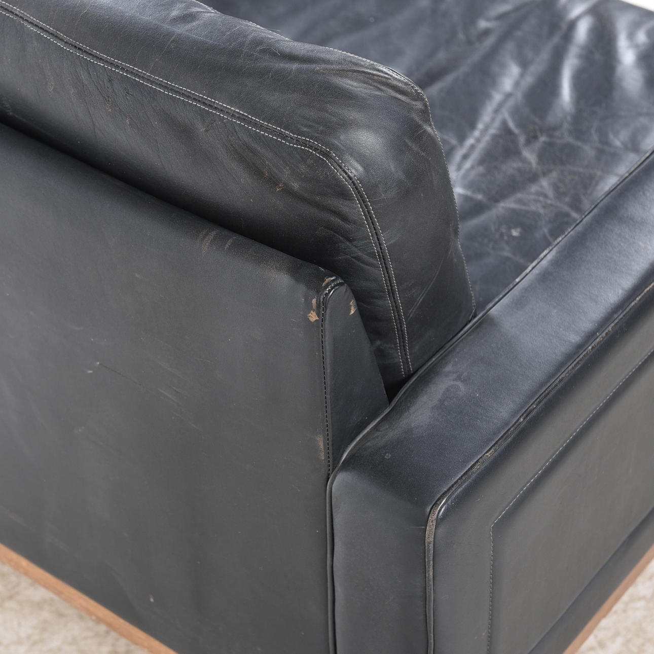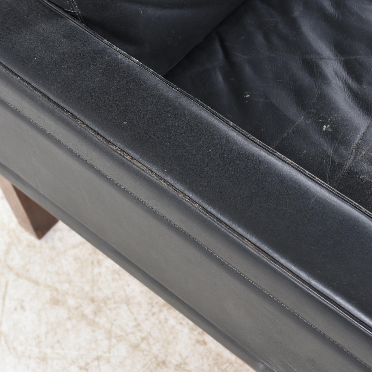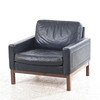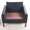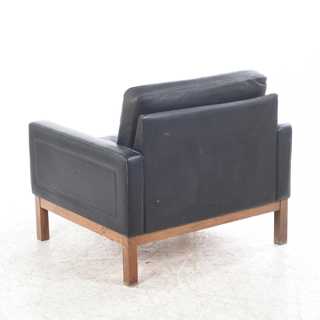 verhoilu musta nahka, löysät höyhenet, jalkapohja petsattua tammea, merkintä alla, korkeus n. 70 cm, istuinkorkeus n. 40, leveys n. 81, syvyys n. 78 cm.