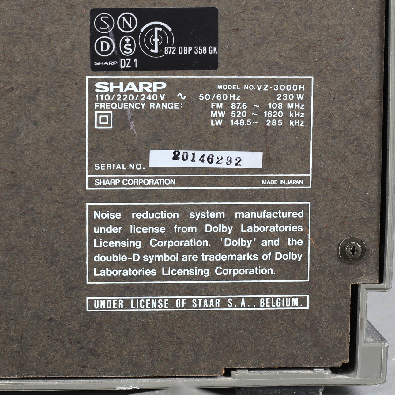 Leveys 60, korkeus 37,5 cm. Mallinumero VZ - 3000, sarjanumero 20146292.