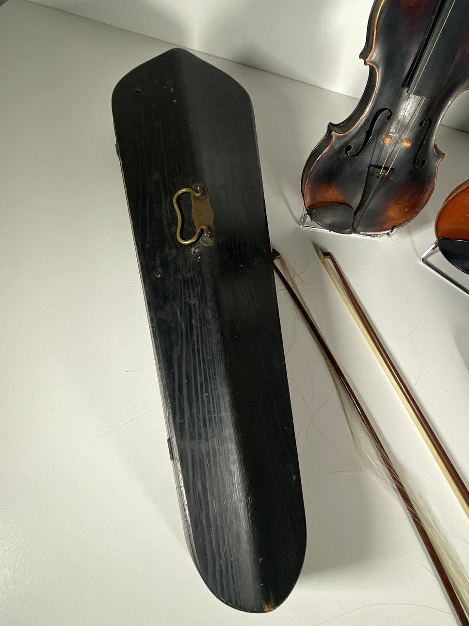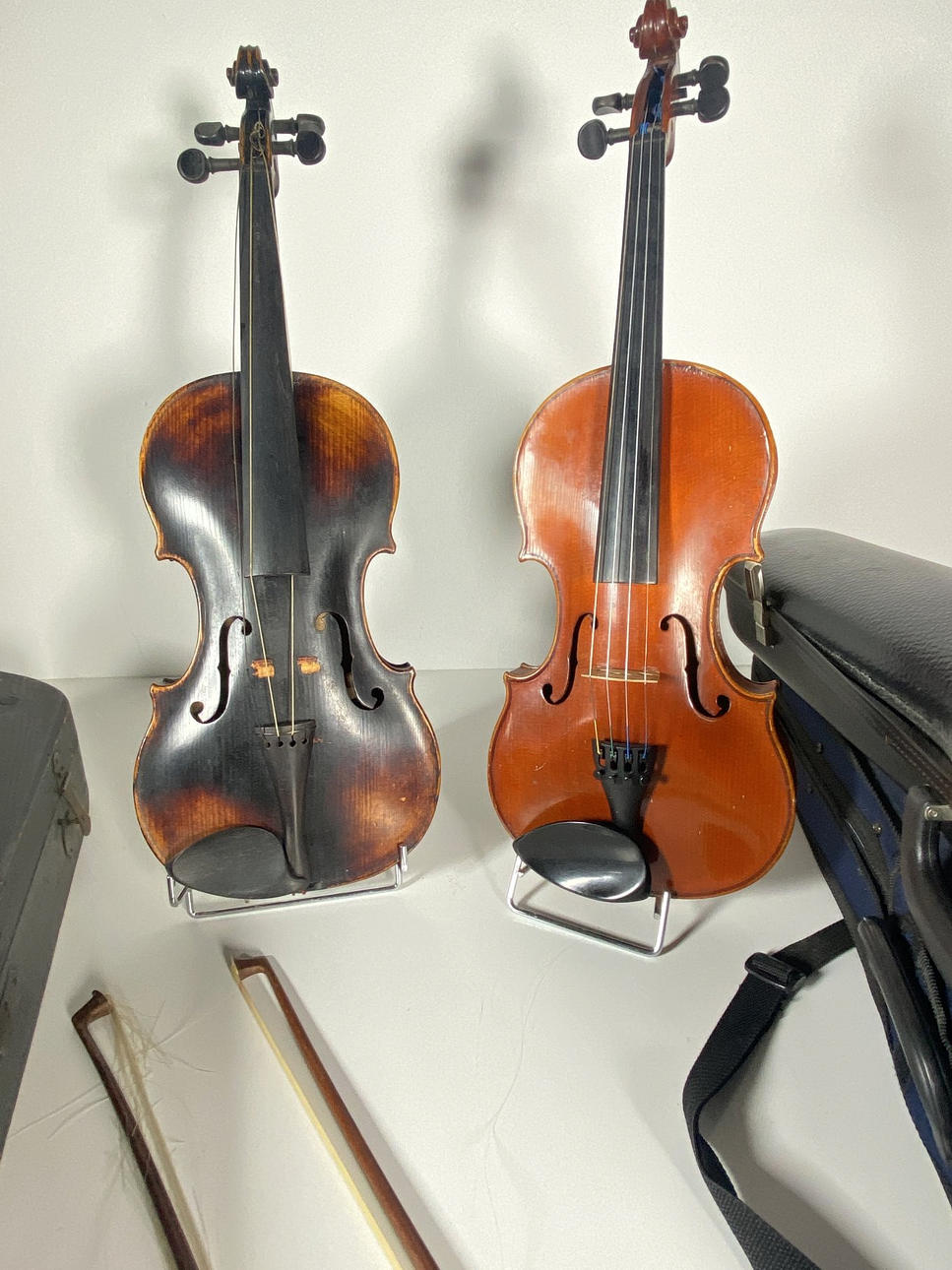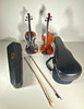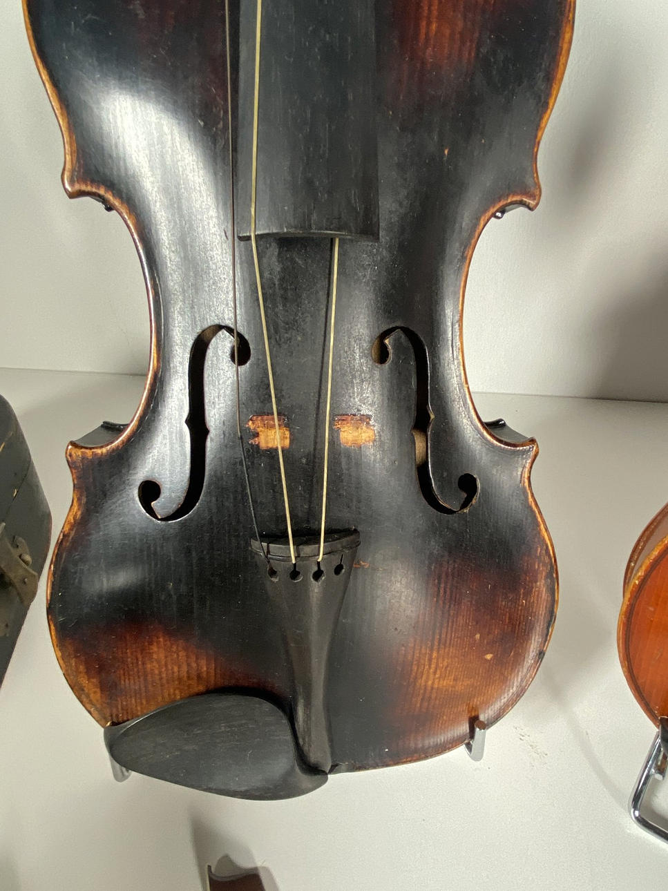Paljon puusta valmistettuja viuluja. koostuu: 2 viulusta ja 3 tyhjästä viulukotelosta. (5).