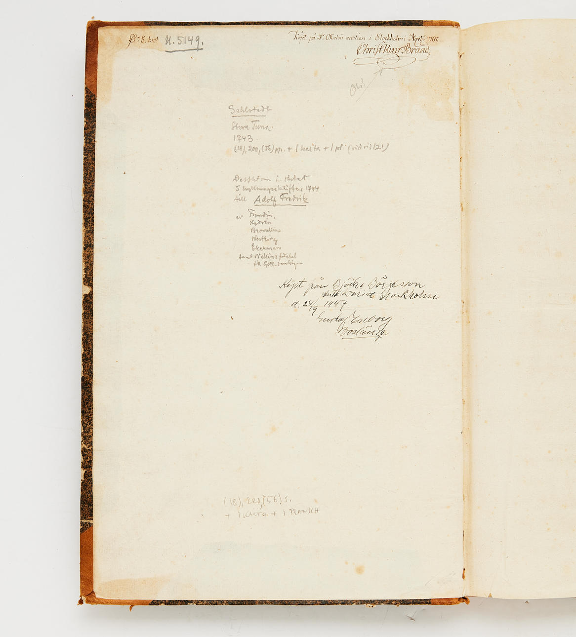 Käytetty nykyaikainen puoliranskalainen sidos. Puhdas lähetys. Päällekkäinen huomautus otsikkosivun ylämarginaalissa. Etusivulla käsinkirjoitettu sisällysluettelo, jossa yliviivat, joissa kokoelmanauhan osia on evakuoitu. Etukannen sisäpuolella merkintä "Ostettu O. Celsii -huutokaupasta Tukholmassa marraskuussa. 1767", alleviivasi Kristus. Hinr. leipää. Muistin alla "Ostettu Björck o. Börjesson Stockholm d. 9.14.1947" alleviivasi Gustav [lukuton], Borlänge.