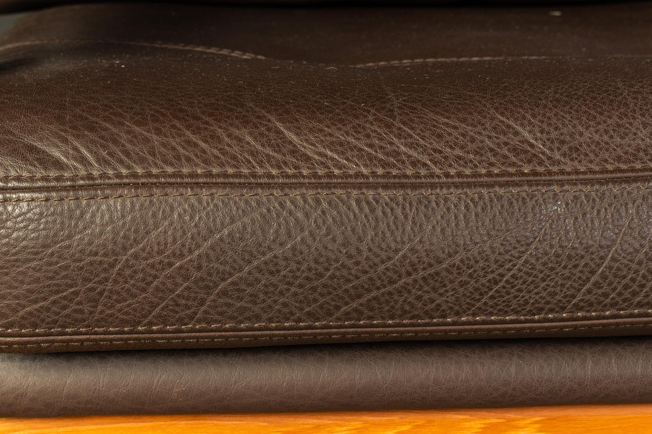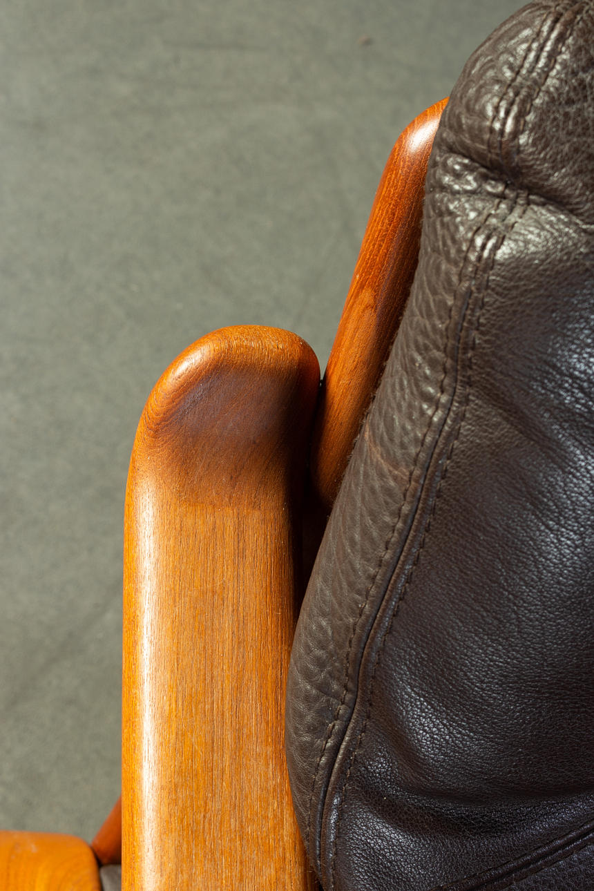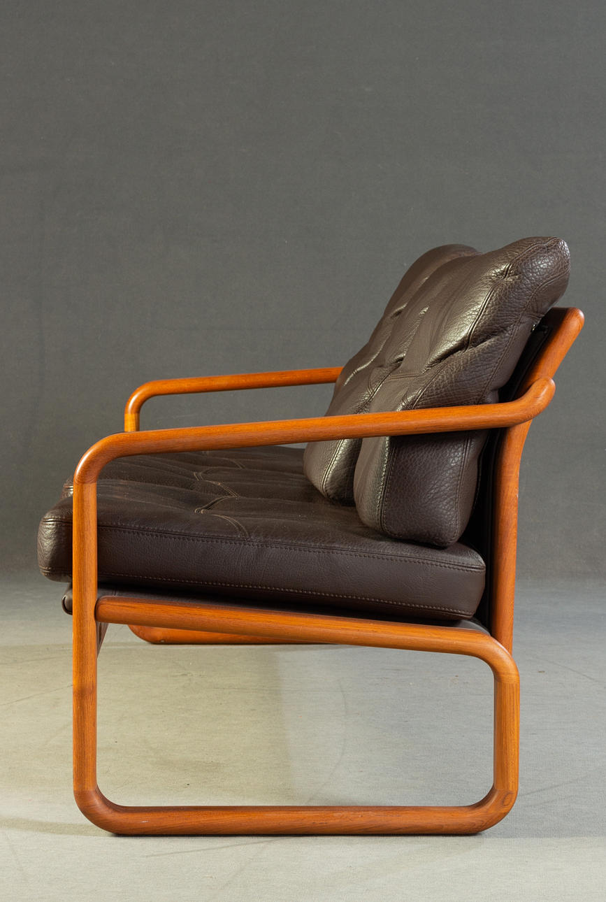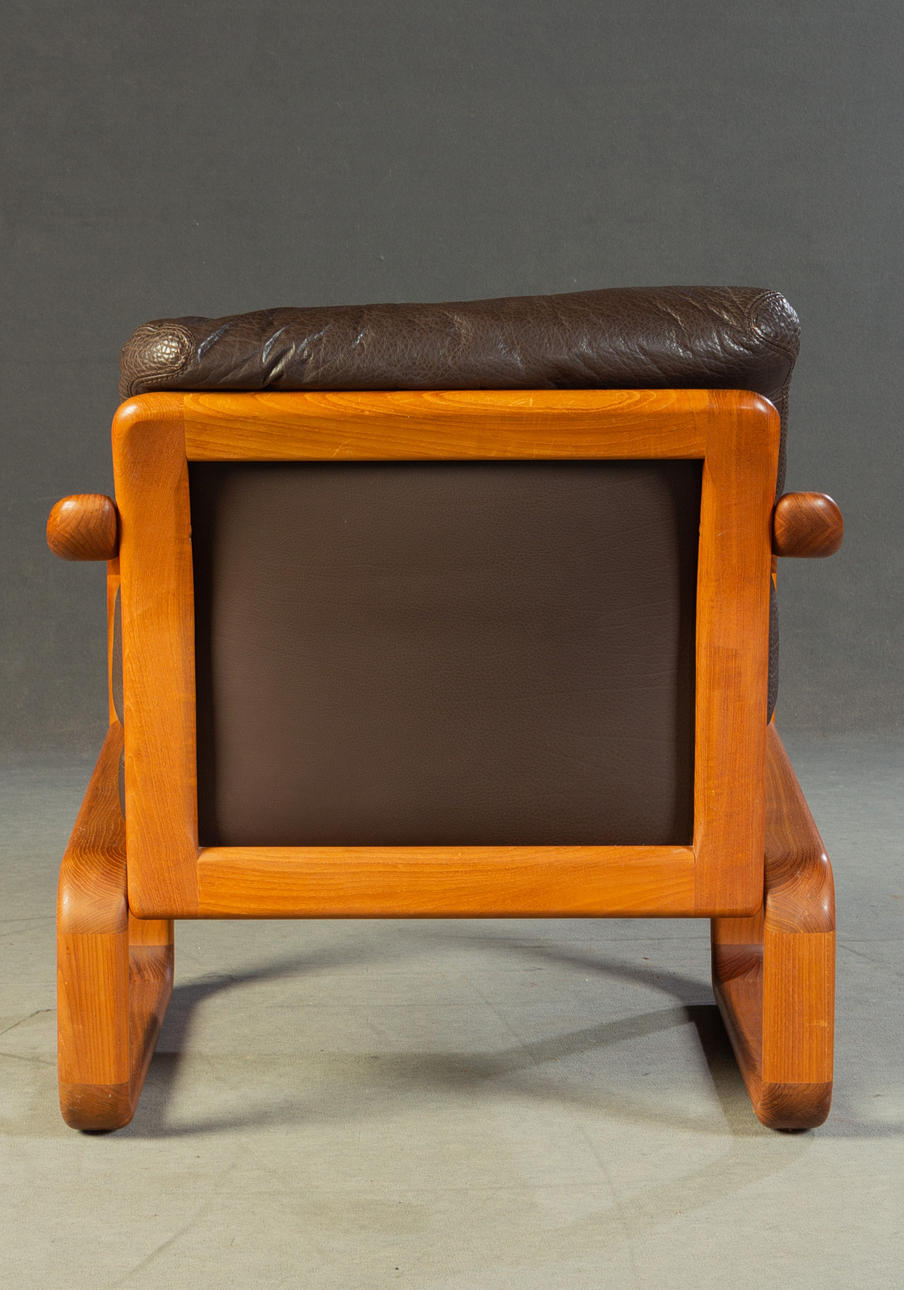 Massiivinen tiikki ja tummanruskea puhvelinnahka. KxLxS: 84x194/73x72cm.