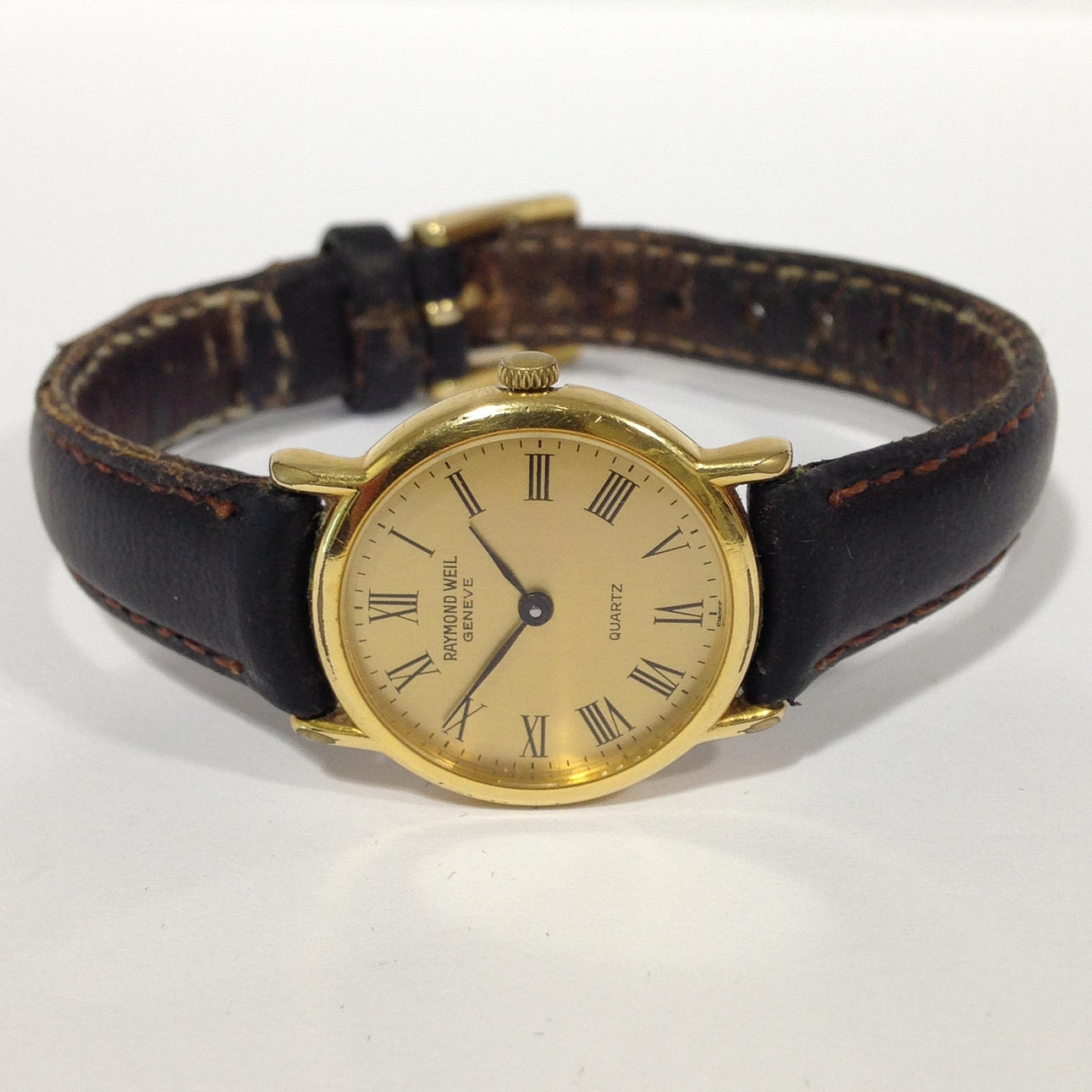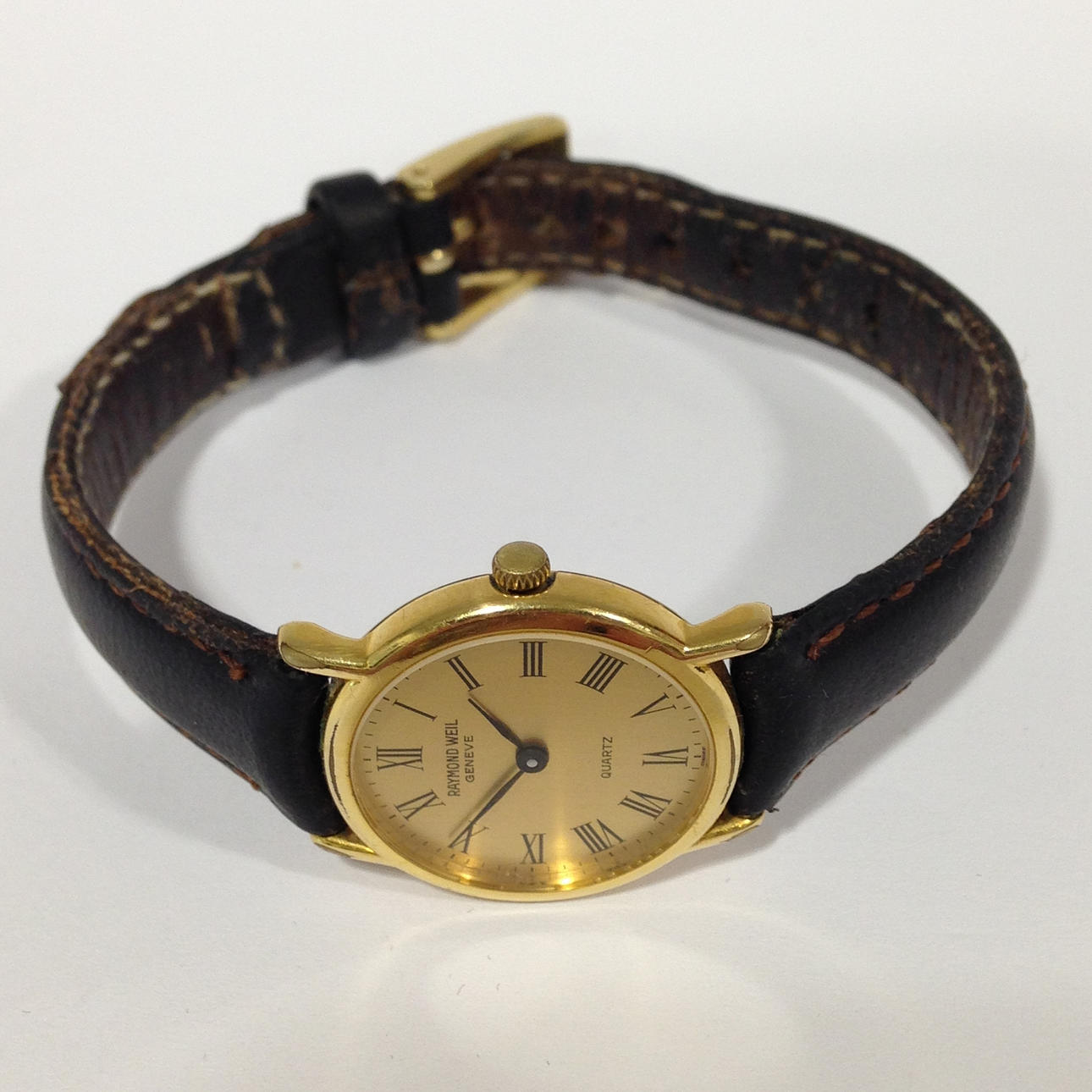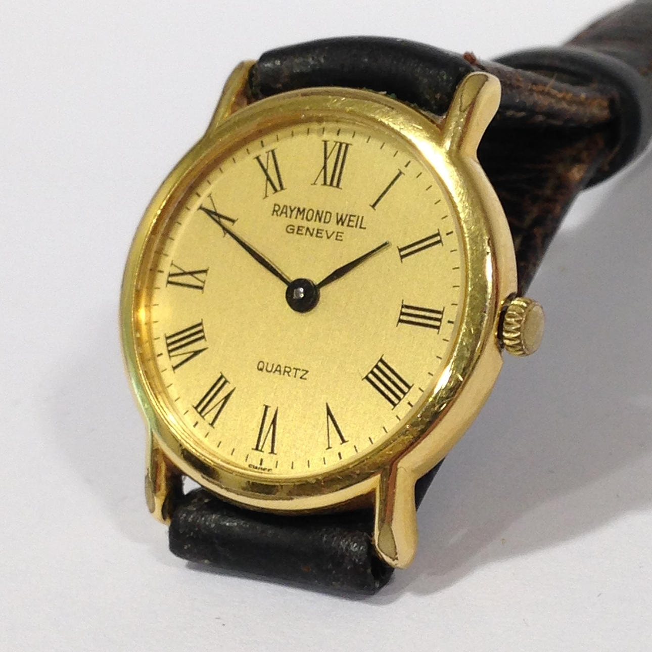 Raymond Weil Geneve 18 ct kullattu kello MERKI: Raymond weil MALLI: Geneve CIRCA: 1920 MUOTO: Pyöreä METALLI: 18 karaatin kullattu KOTELO: Pyöreä LIIKKEET: Kvartsi KÄDET: Istukehihnat: Nahka SARJA: 5758 roomalaiset numerot yhteensä: kultaa paino: 12,5 g.