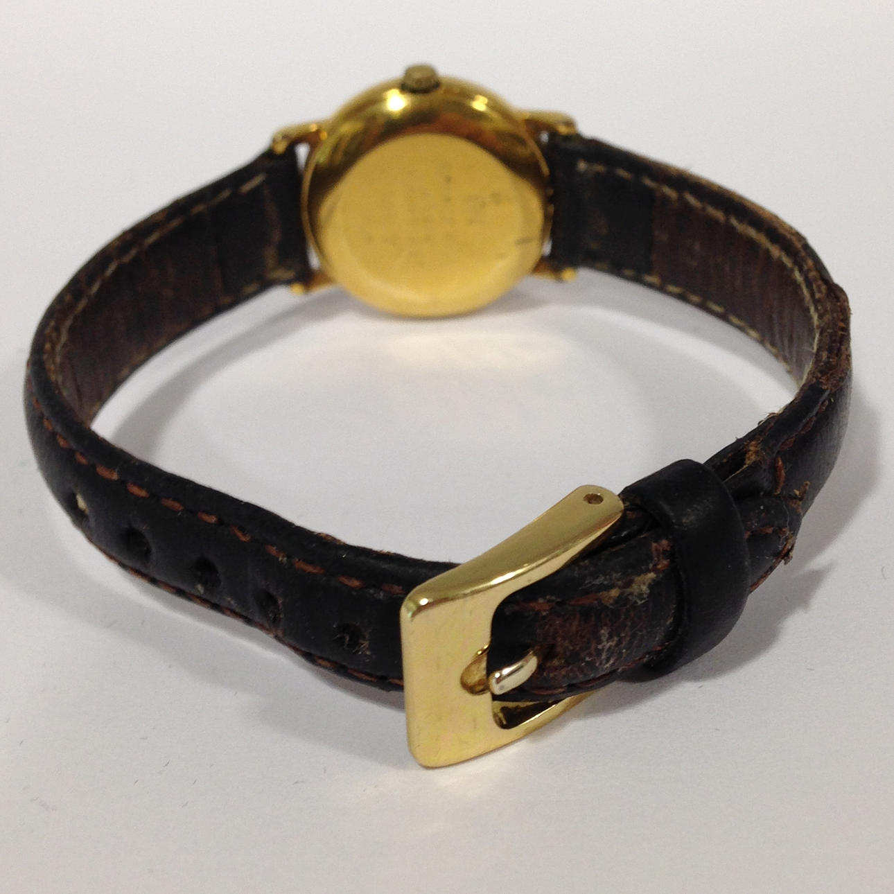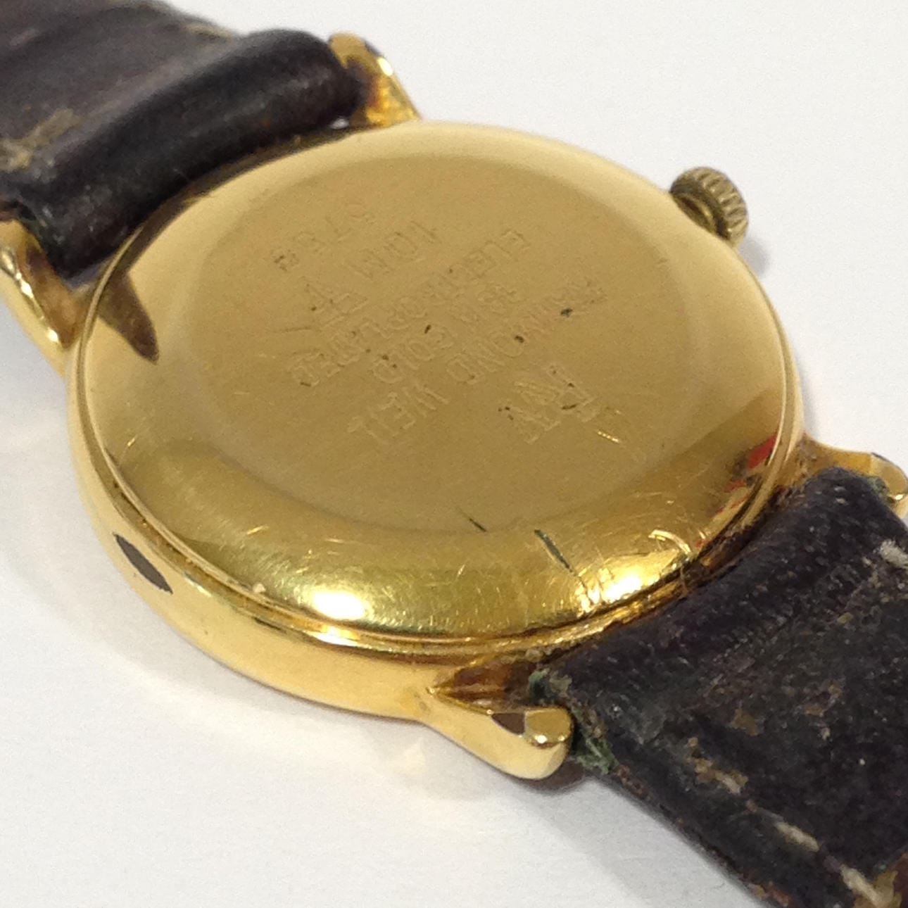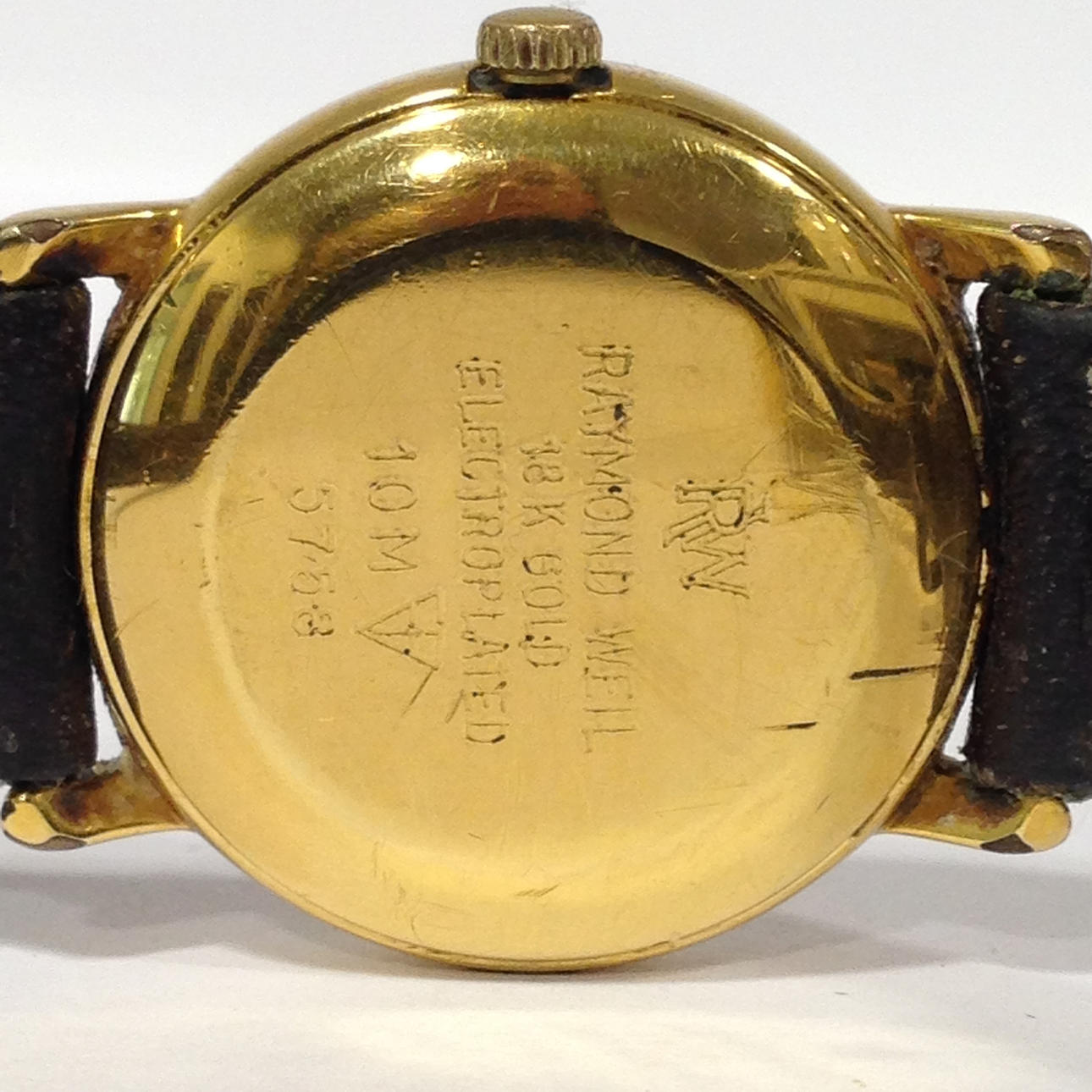 Raymond Weil Geneve 18 ct kullattu kello MERKI: Raymond weil MALLI: Geneve CIRCA: 1920 MUOTO: Pyöreä METALLI: 18 karaatin kullattu KOTELO: Pyöreä LIIKKEET: Kvartsi KÄDET: Istukehihnat: Nahka SARJA: 5758 roomalaiset numerot yhteensä: kultaa paino: 12,5 g.