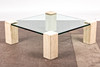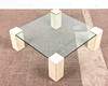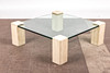 Sohvapöytä / lasipöytä, travertiini, lasi. Sohvapöytä neljällä travertiinijalalla ja nelikulmaisella lasitasolla, K.36cm, L.103cm, L.103cm.