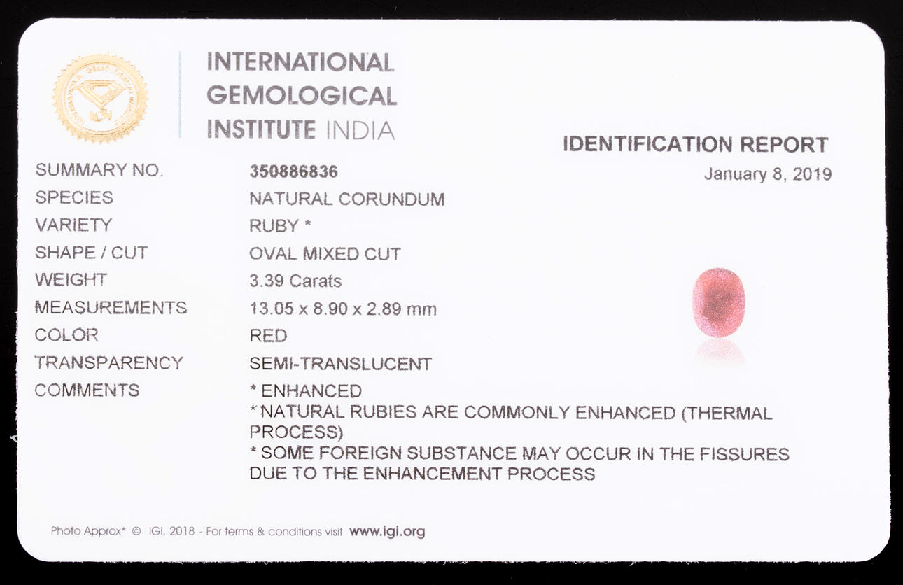 Luonnonrubiini, leikkaus: soikea sekoitettu leikkaus, mitat n. 13,05 x 8,90 x 2,89 mm. paino: n. 3,39 ct. Mukana todistus.