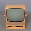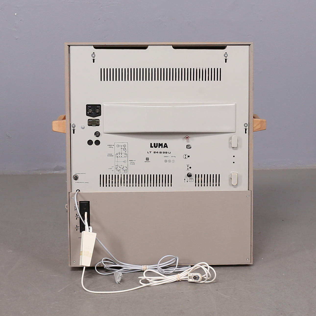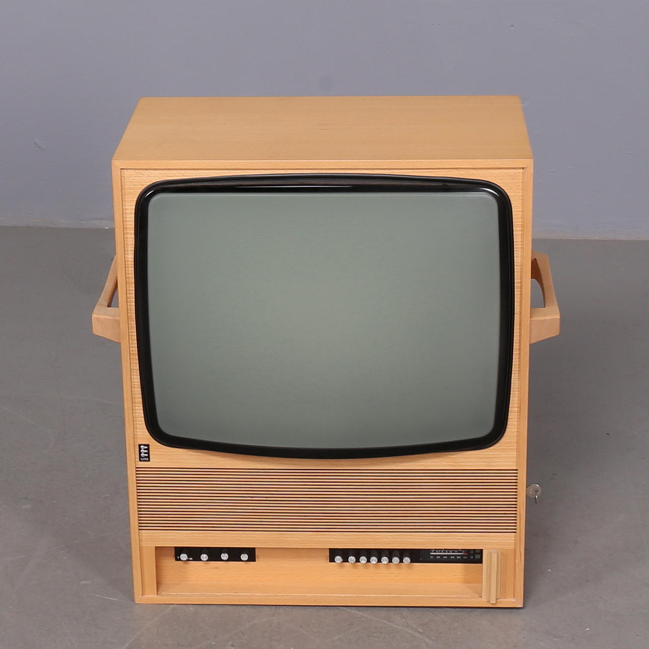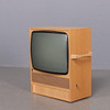 Alusta tammiviilua, ohjauspaneeli liukuoven takana, lukittava. Sivuilla kahvat. Mukana pöytäantenni. Mitat: 57x31 cm, korkeus 69 cm.
