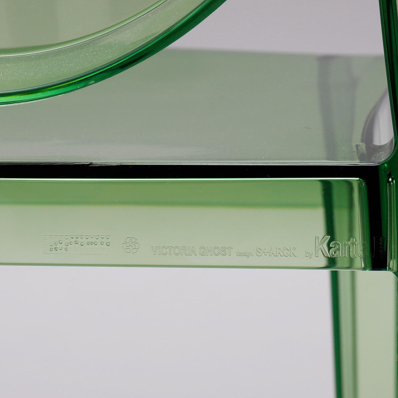 Vihreäksi sävytetty polykarbonaattimuovi, merkitty, suunniteltu 2005, istuinkorkeus 47 cm.