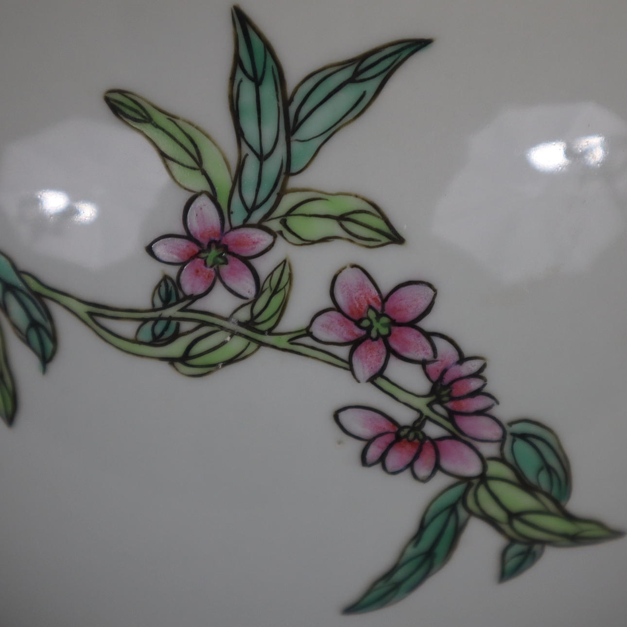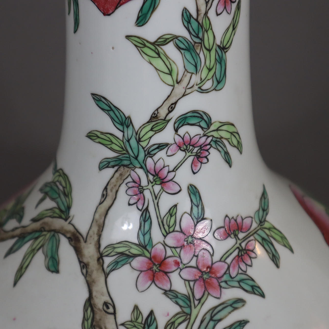 "Tian qiu ping" -tyyppinen, posliini, jossa maalaus "famille rosen" väreillä: ympärillä kukkiva persikan oksa kahdeksalla suurella hedelmällä, ei merkitty, korkeus n. 39 cm.