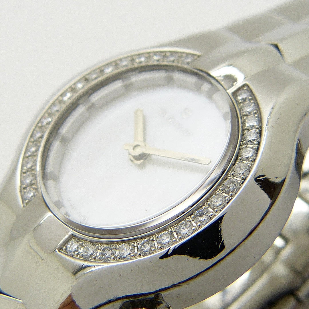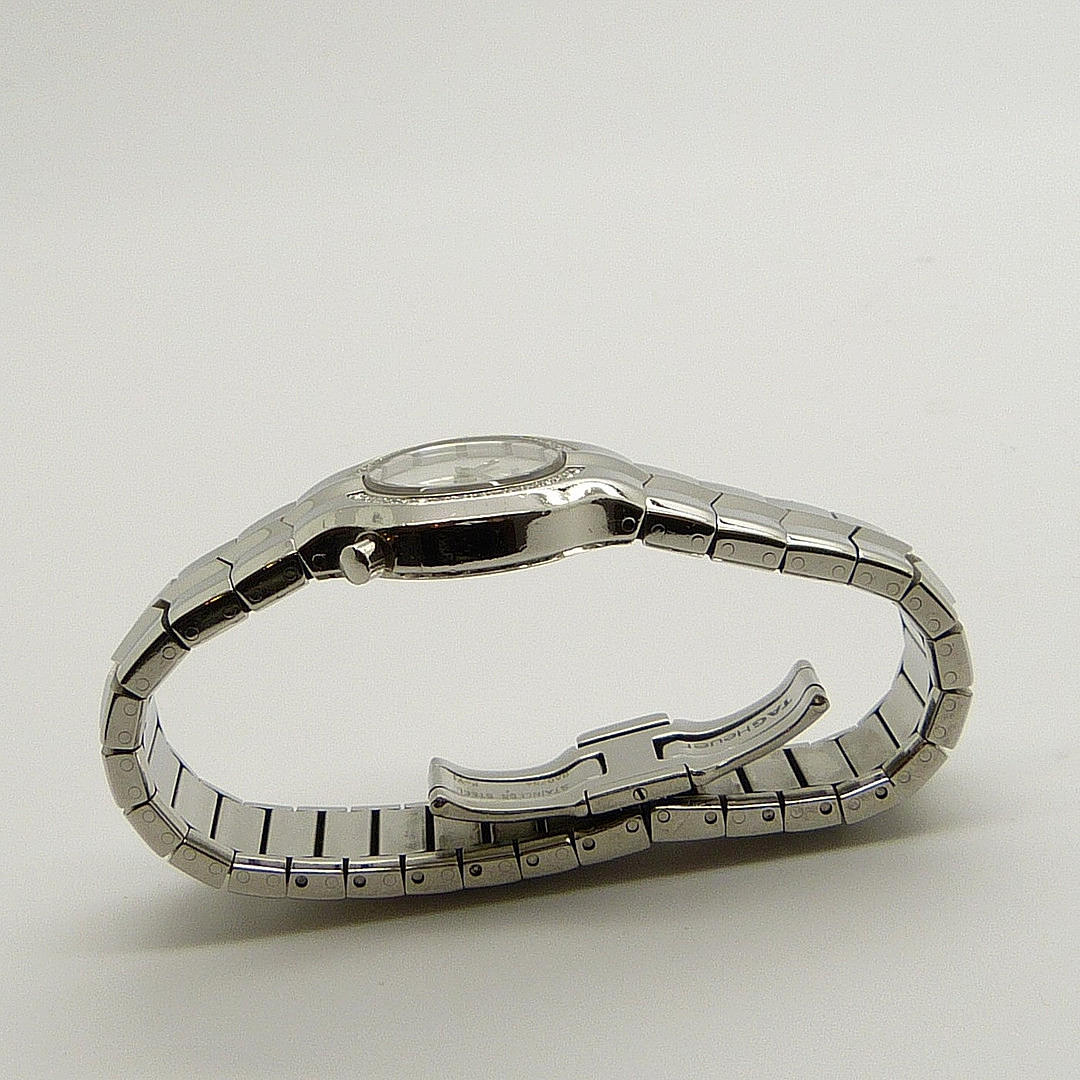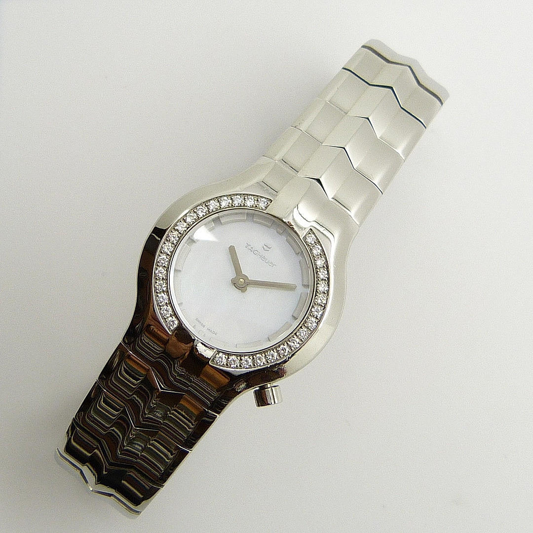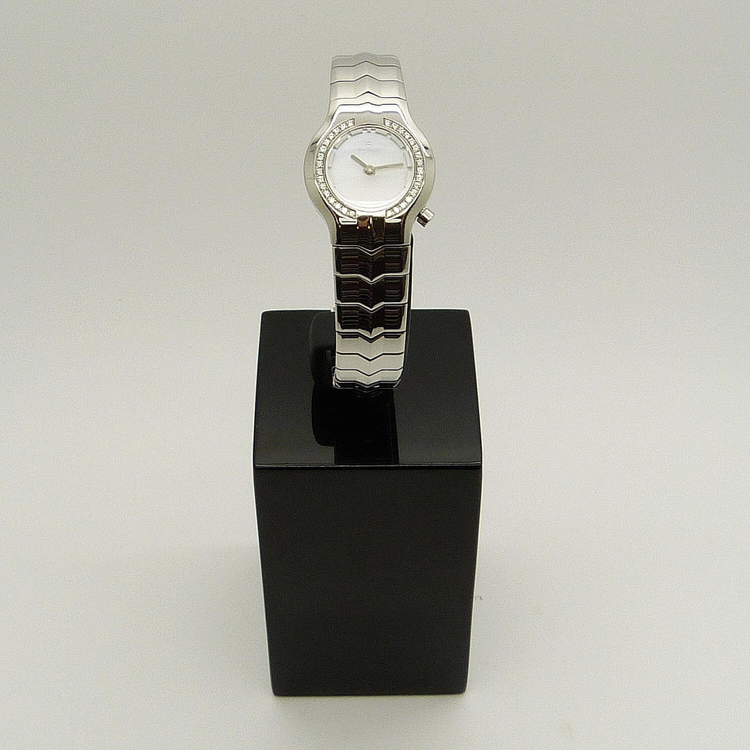 Tärkeimmät ominaisuudet: • Tuotemerkki: Tag Heuer • Valikoima: Alter Ego • Arvioitu valmistusvuosi: 2003 • Valmistusmaa: Sveitsi • Sukupuoli: Naiset • Liikkeet: kvartsi • Timantit: pyöreä, briljanttihiottu, 0,50 karaattia: noin, määrä: 32 • Timanttien väri: FG n. • Timanttien kirkkaus: VS - erinomainen SI, n. • Mallinumero: WP1414 HQ1149 • Vedenkestävyys: 100 metriä • Etuosa: Helmiäisvalkoinen • Kellotaulu: Ei numeroita. Tunti- ja minuuttiosoittimet • Näyttö: Analoginen, minimalistinen • Kotelon materiaali: Ruostumaton teräs, timanttikehystetty kehys • Rannekorun materiaali: ruostumaton teräs • Kotelon muoto: Pyöreä • Kotelon halkaisija: noin 25 mm • Lukko: Kaksinkertainen käännös • Leimattu lukkoon : BA0754 P-V1 • Korvakkeen leveys: noin 9 mm • Rannekorun (hihna) tyyli: kalanruoto, kohotettu selkäranka Kokonaispaino: 71,7 grammaa.