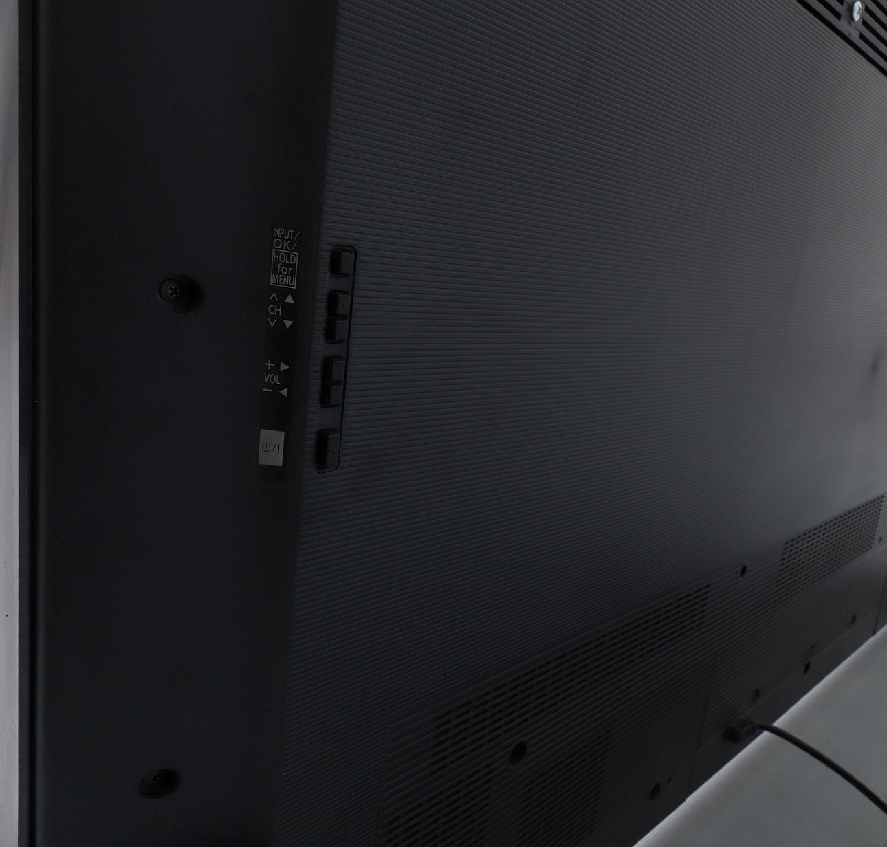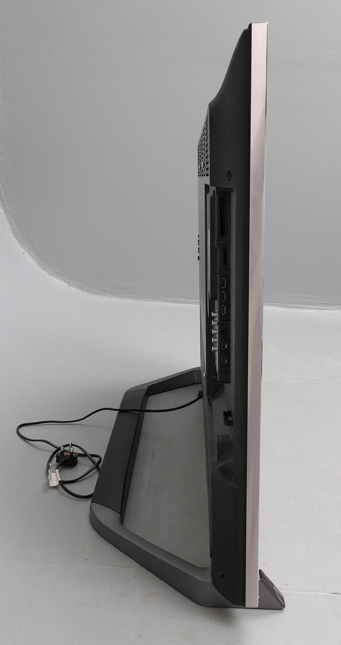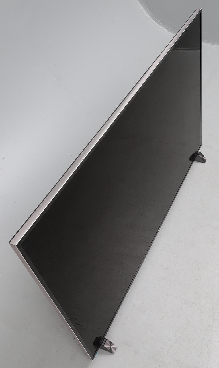 metallitelineellä, kahdella kaukosäätimellä ja käyttöohjeella, n. 130 cm leveä x 76 cm korkea x 6 cm syvä, jalusta 34 cm syvä.