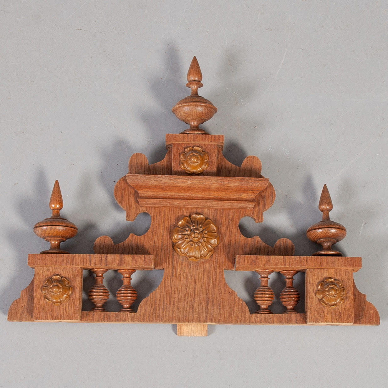 Kokonaiskorkeus 105 cm ja leveys noin 30 cm. Rikkaasti veistetty tammi.