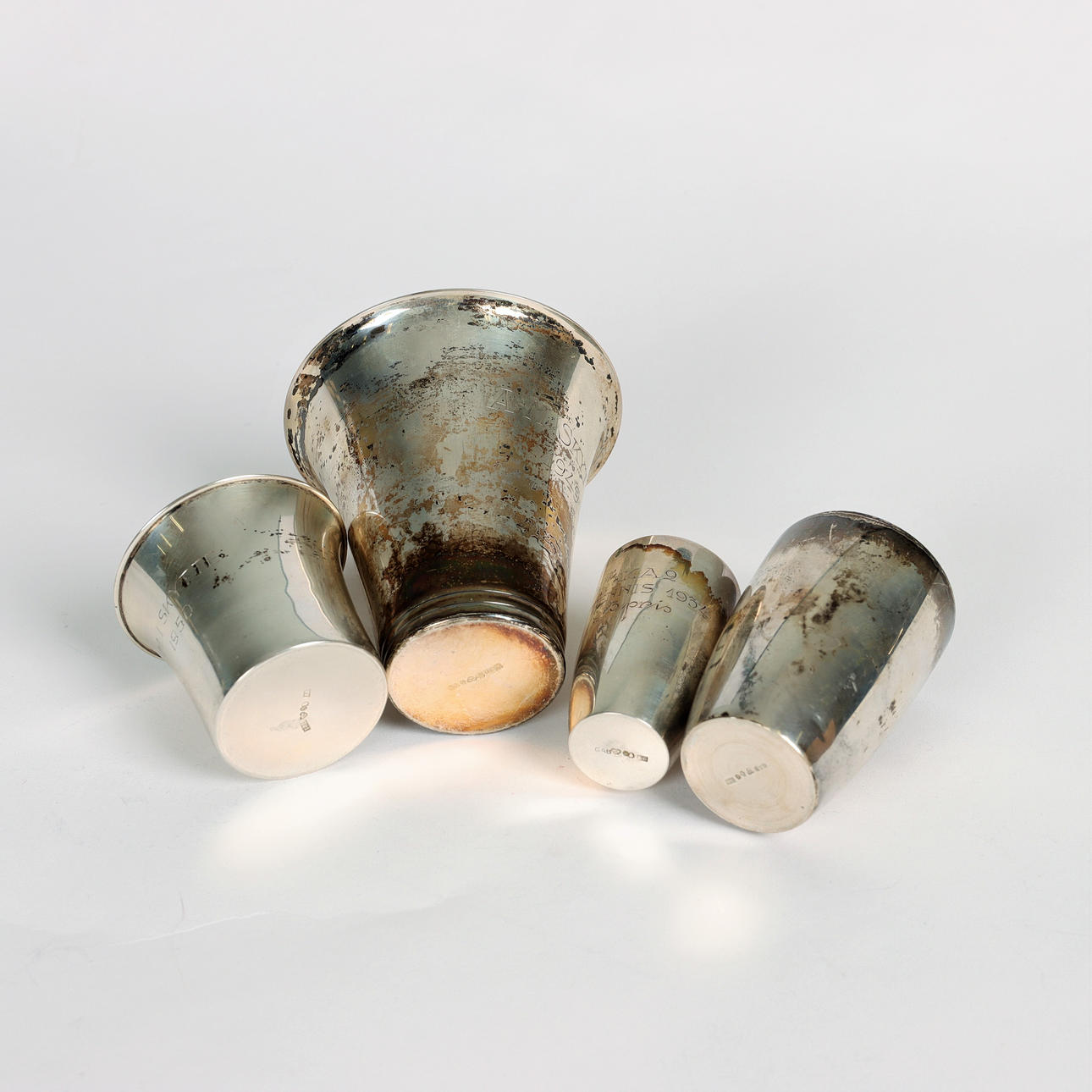 1 lieriömäinen kansi purkki, "CAROLUS XI" -leimat CGH, H9. Korkeus 9,5 cm, sisäosa puuta ja muovia 1 kuppi leimattu TESI, Y8, korkeus 7,5 cm 1 kuppi leimattu GAB D8, korkeus 6 cm 1 kuppi epäselvä leima, kissan jalka, X8, korkeus 4,5 cm 1 kuppi, leimattu GAB, E8, korkeus 5 cm.