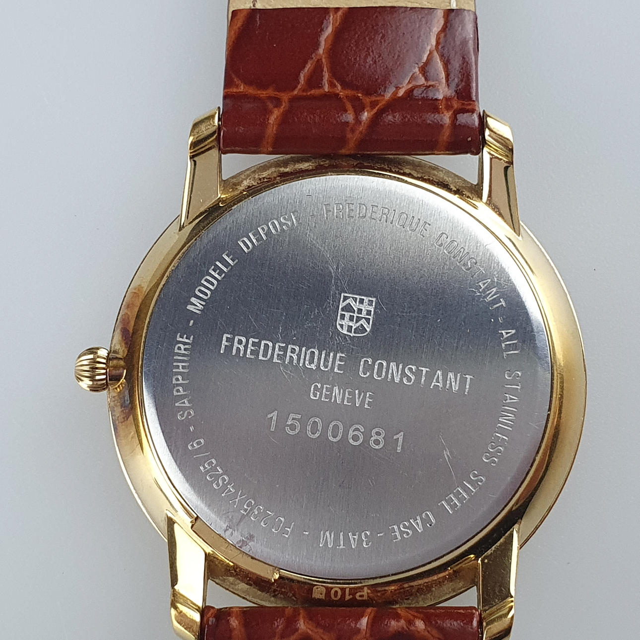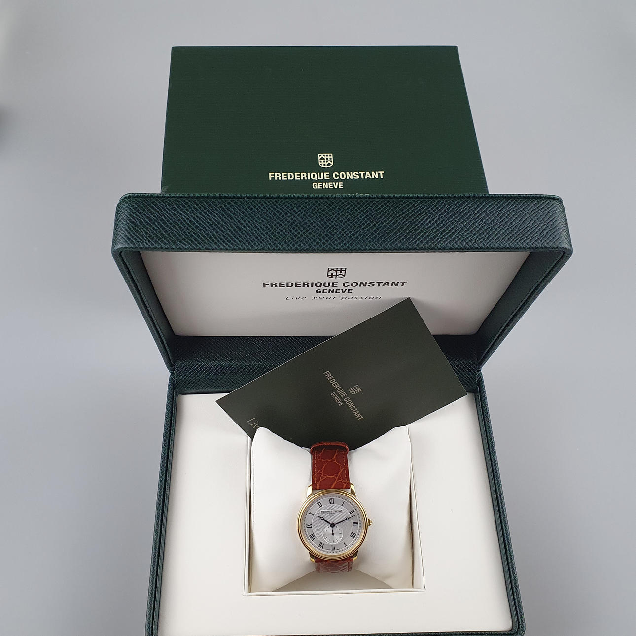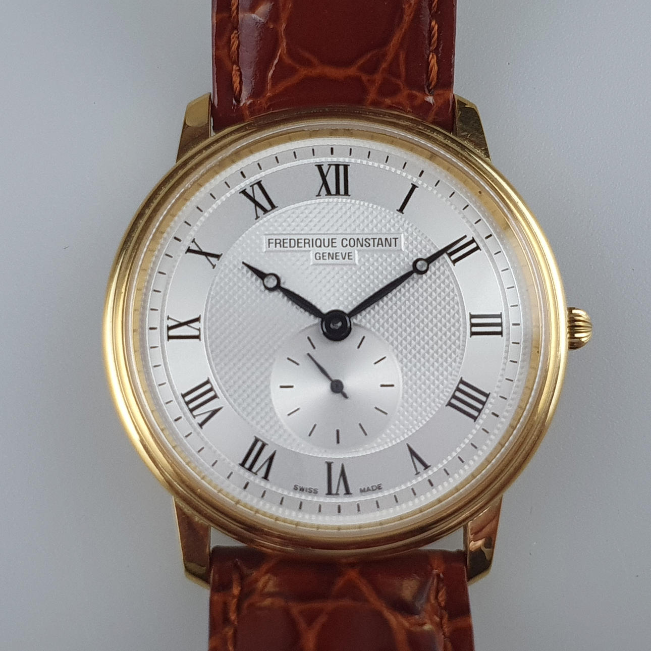 Frederique Constant Geneve, miesten rannekello, Slimline Gents Small Second, FC-235X4S5, viite. 1500681, kullattu ruostumaton teräskotelo, D.: n. 37 mm, safiirilasi, hopeanvärinen kellotaulu erillisellä sekuntinäytöllä, roomalaiset numerot, uusi ruskea nahkaranneke neulasoljella, kvartsiliikkeet, erittäin hyvässä kunnossa, vähäisiä käytön jälkiä, alkuperäispakkauksella.