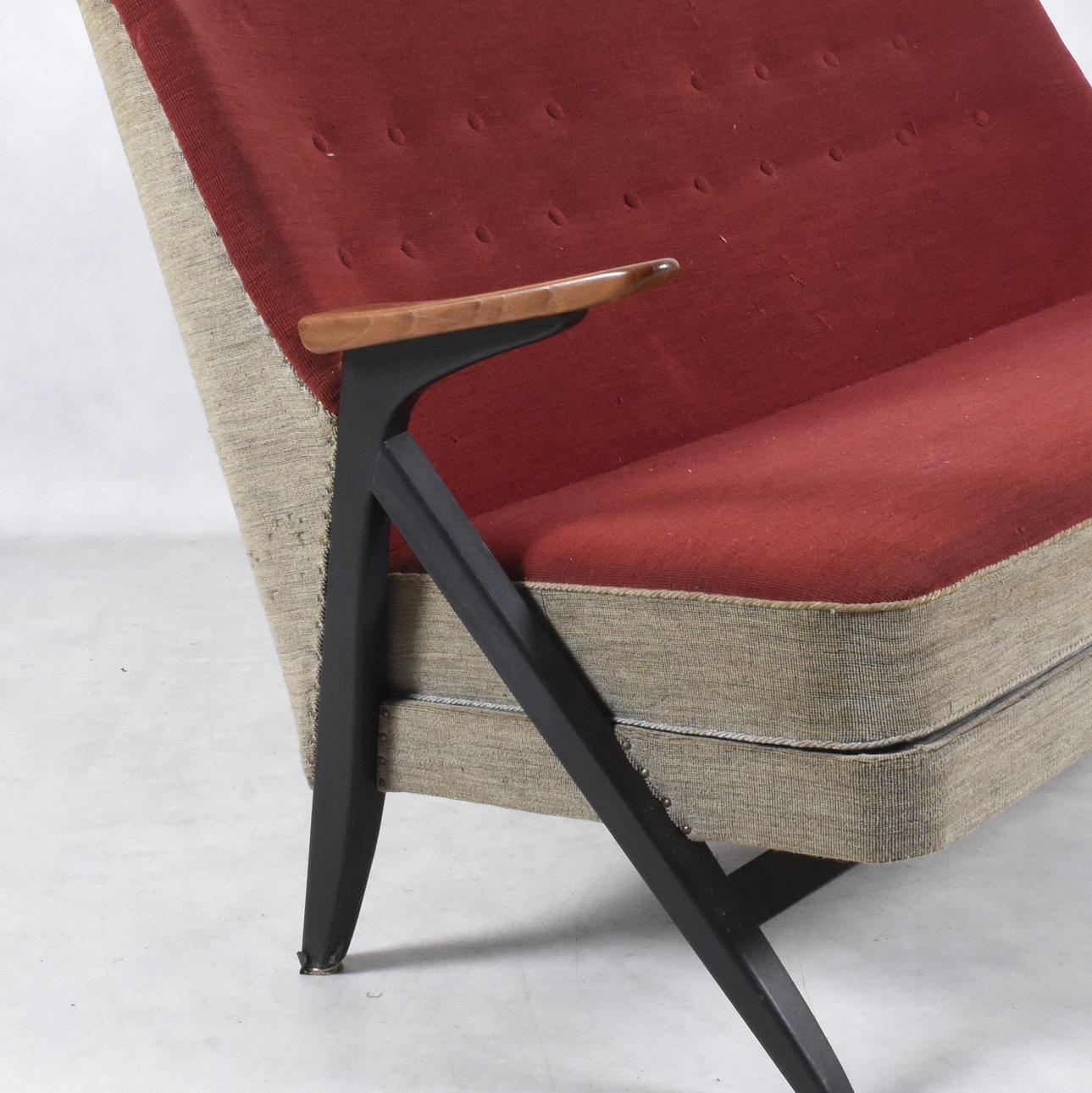 Tahroja, kulumaa ja pieniä reikiä.