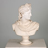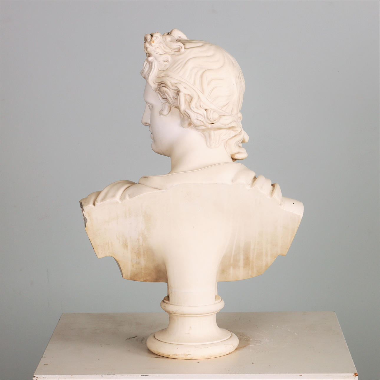 Suuri rintakuva, roomalainen mieshahmo. Kipsimassa/sementti kiiltävällä pintakäsittelyllä. Korkeus 64 cm 45 x 25 cm Jalan halkaisija 18 cm.