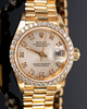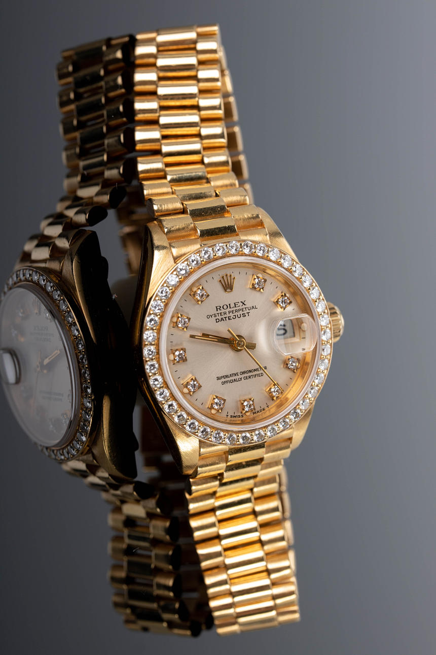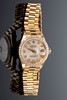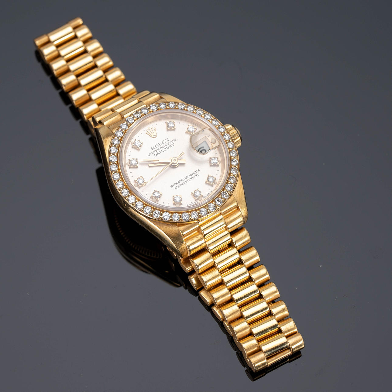 Rolexin NAISTEN RANNEKELLO , malli 'Datejust', viite. 69138. Kotelo 750 kultaa, kultainen kellotaulu 10 timantilla, kehys timanttilla, päivämäärä kello 3 Quickset-toiminnolla, safiirilasi, President-rannekoru 750 kultaa taitettavalla lukko, automaattinen liike cal. 2135. kotelon Ø n. 26 mm Kello oli käynnissä tarkastushetkellä, Stockhoms Auctions ei takaa toimivuutta.